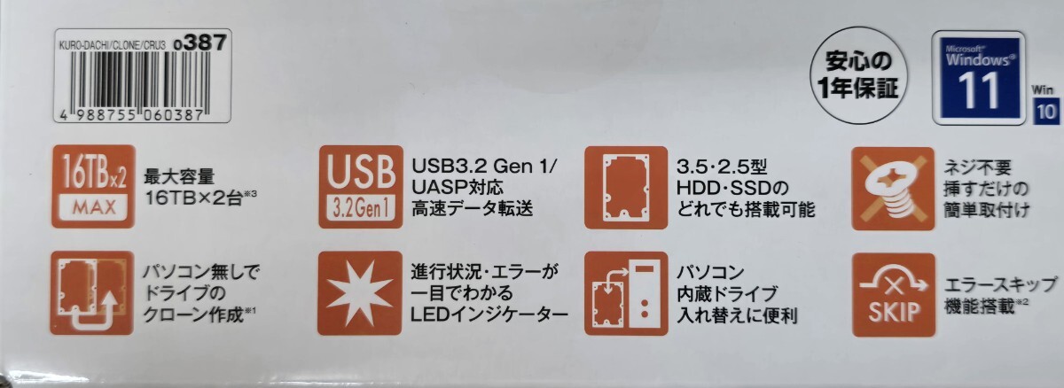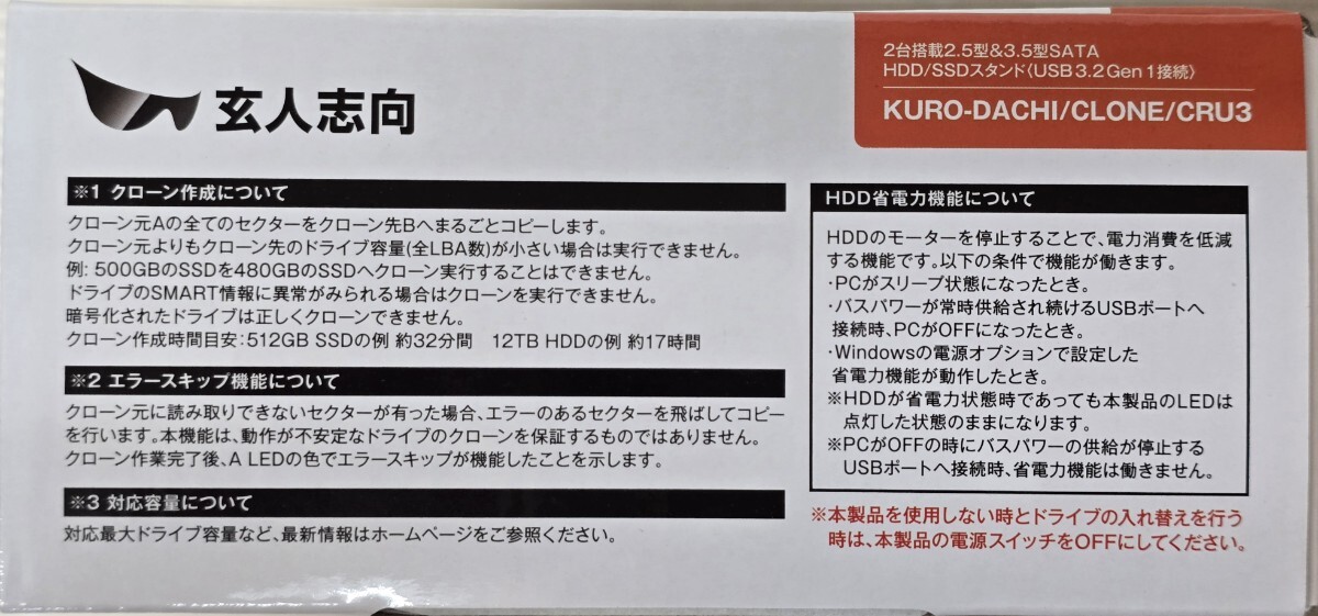 商品名 : 【未開封】玄人志向/ SSDやHDDをまるごとコピー/ KURO-DACHI/ CRU3/外付 SSD HDDスタンド/ CLONE/エラースキップ/16TB×2台搭載