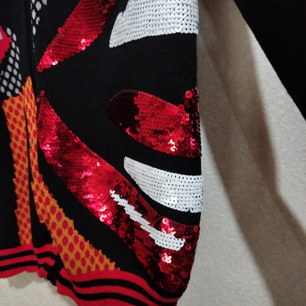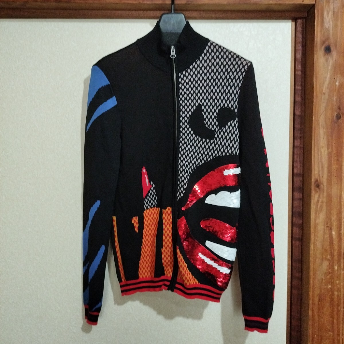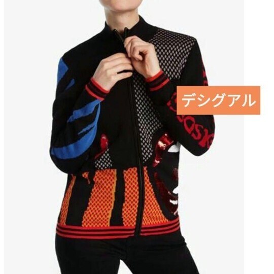 袖にあしらわれたDesigualロゴや、赤いスパンコールで描かれた大きなリップには、鮮やかな色を用いたコミックスタイルが感じられます。