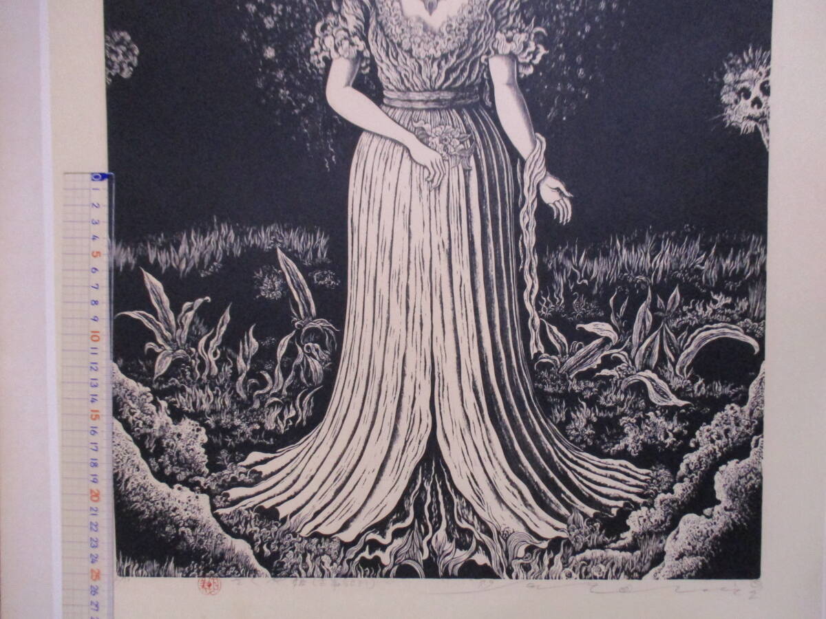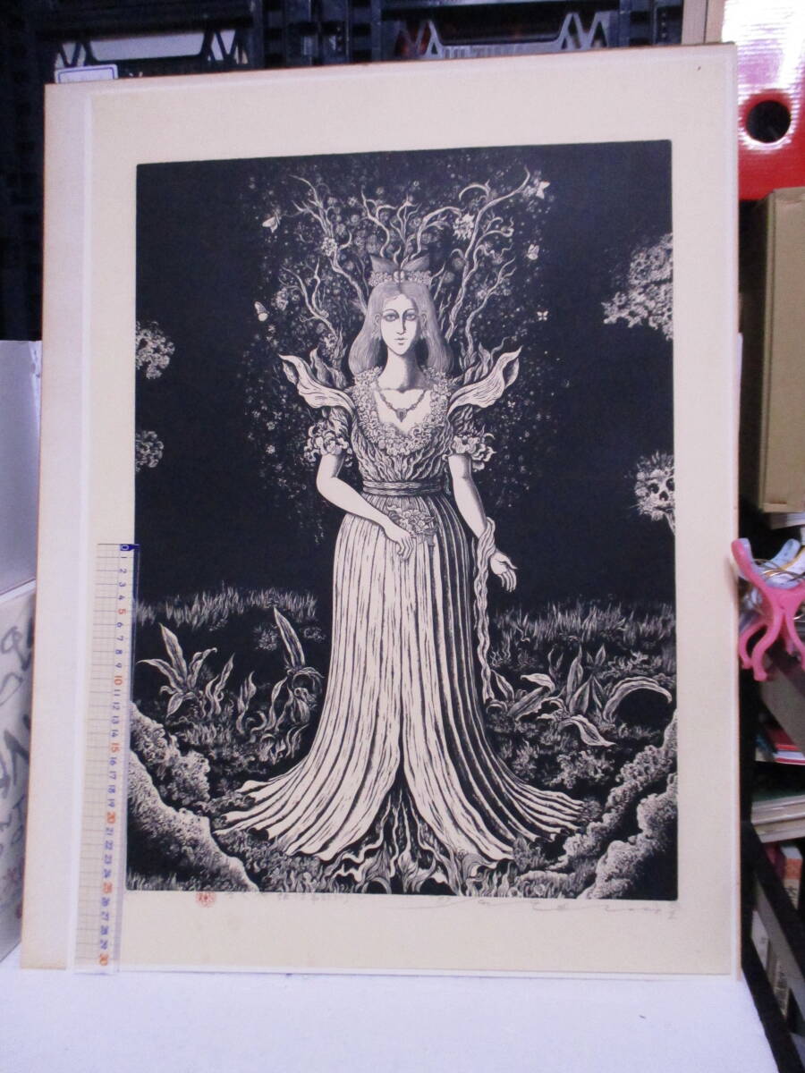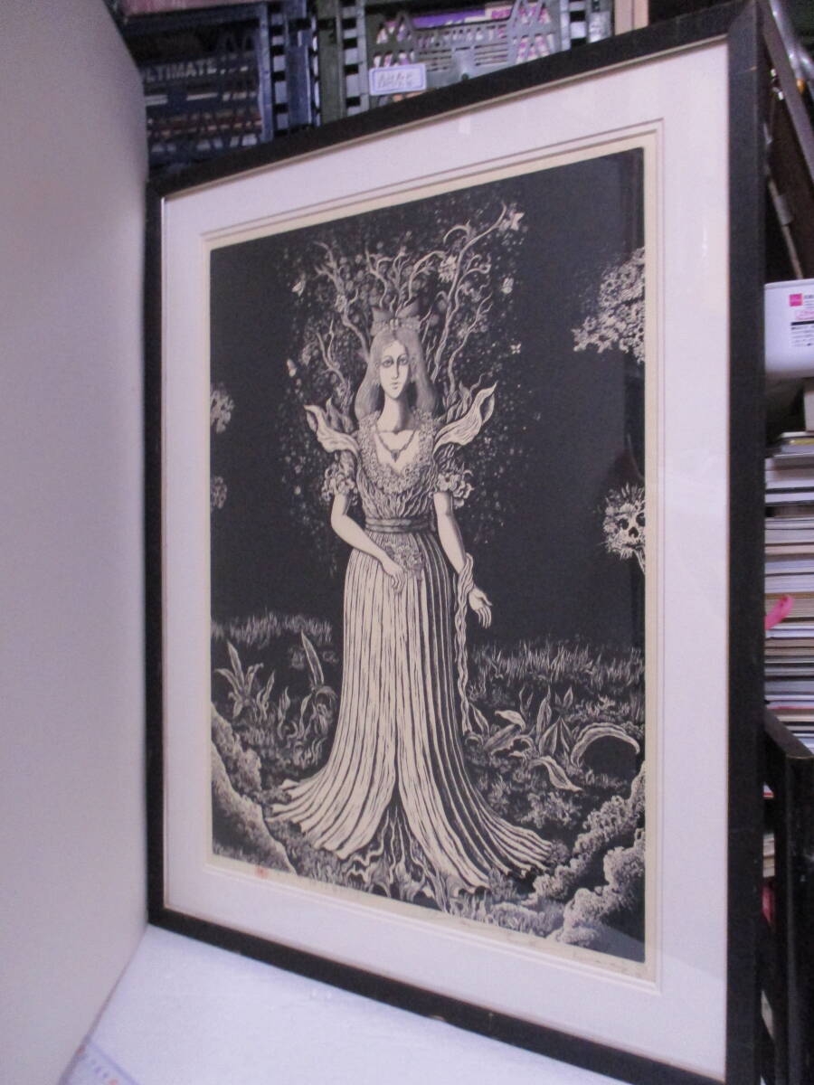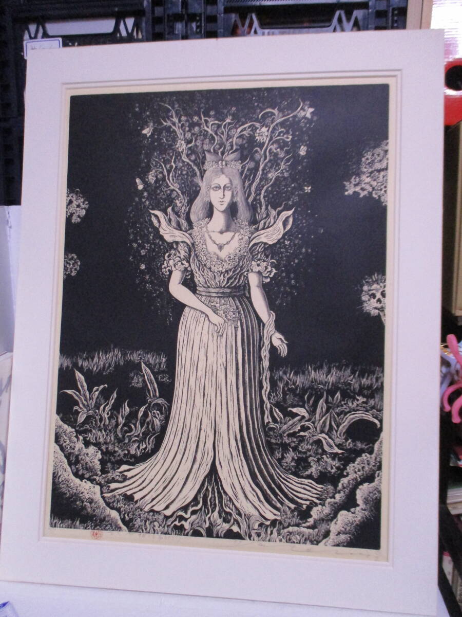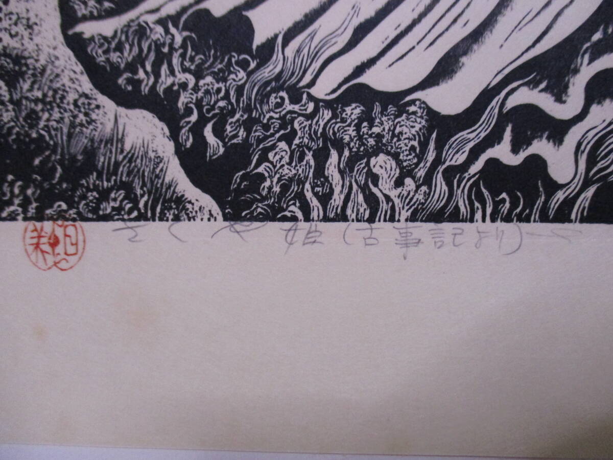 | 商品名 | 日下里美(1935年生・棟方志功門下)版画「さくや姫(古事記より)」限定30の4 サイン・署名 額のサイズ695X544ミリ 諸星大二郎風の作品 |