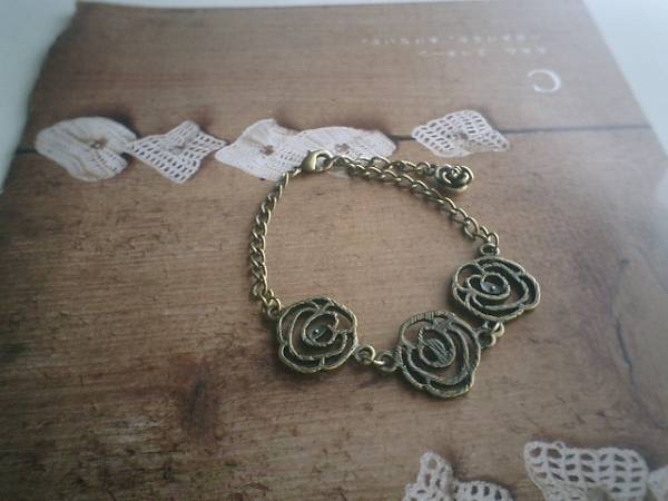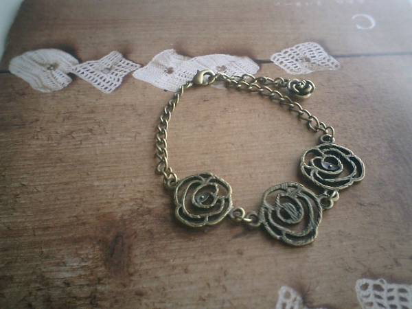 ロゼッタのおめかし・・シリーズです♪薔薇とクロス・・シックな薔薇のブレスレットです♪♪20ミリ位の薔薇のメタルチャームのブレスレットはキュートな表情です♪長さは全長23センチ位で調節自由です♪お揃いのネックレスやブレスレットやピアスも出品しています♪♪シンプルで長く着けていただけるデザインを考えて作りました♪ハンドメイドをご理解頂いてノークレーム、ノーリターンでお願いします