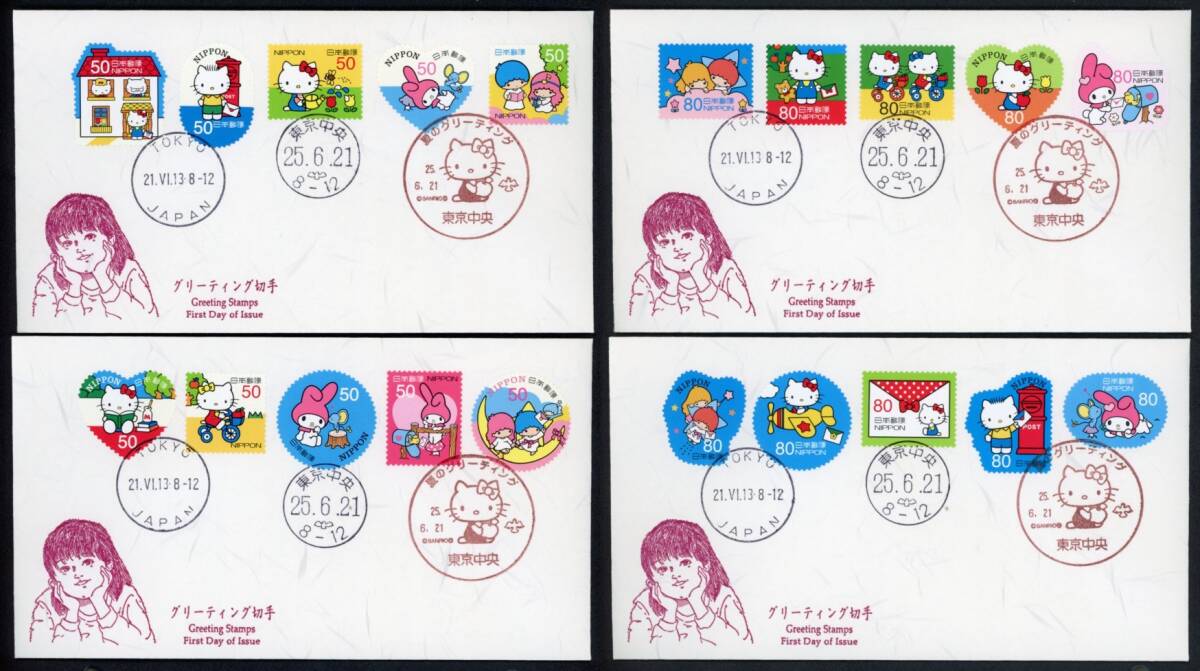 1071 【FDC】2013夏のグリーティング「ハローキティ・マイメロディ・リトルツインスターズ」[東京中央/25.6.21/鳴美版](解説書なし)