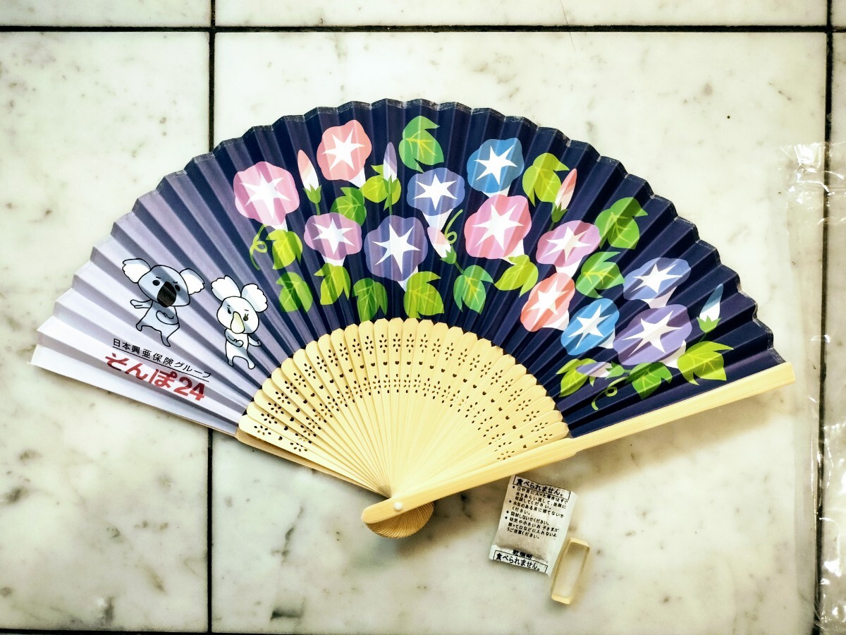 扇子を広げたところ「そんぽ24」の文字が入ってますので、その販促品と思われますが、ピンクとブルーの素敵な朝顔柄が入っています。