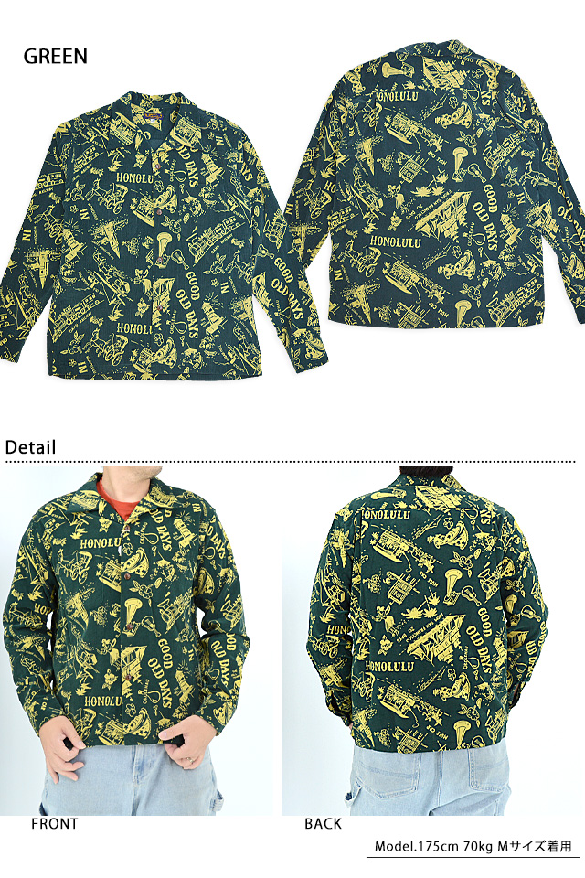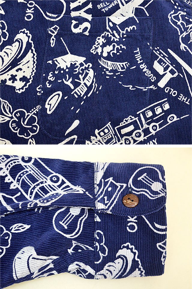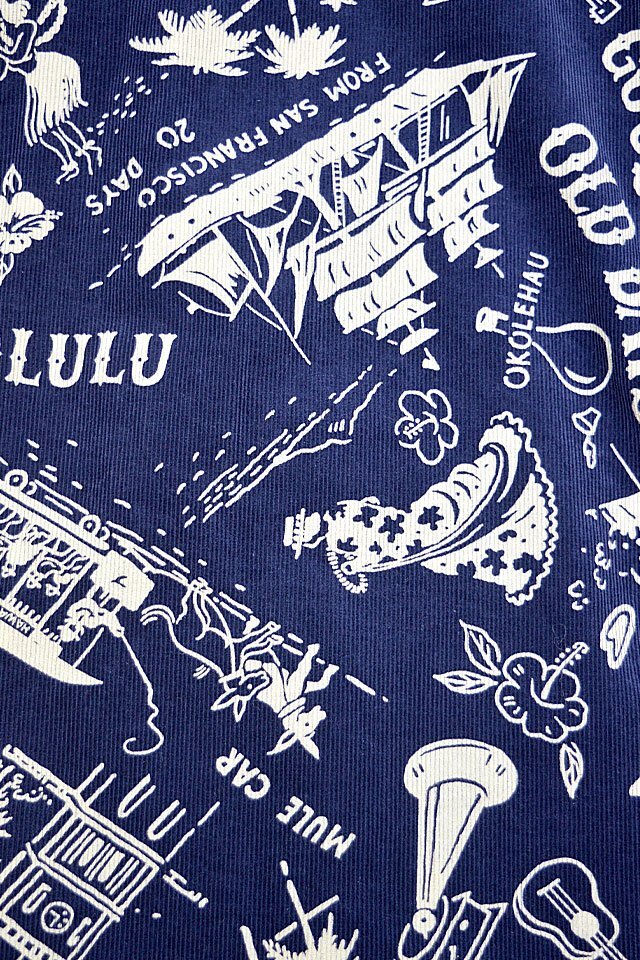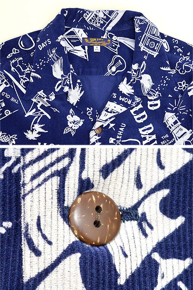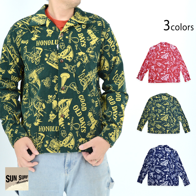 アロハシャツの黄金時代とされる1930~50年代にかけて作られた「ヴィンテージ」と呼ばれる貴重なアロハシャツを再現し、現代に蘇らせているブランド「SUN SURF」から「GOOD OLD DAYS」コーデュロイ長袖オープンシャツ(SS29338)のご紹介です。 1940年代後期に作られたオアフ・ガーメント社の作品です。 「古き良き時代」というタ イトルが付けられた本作に描かれているのは、南国の楽園として華やかな発展を遂げる前のハワイ。 馬車やオアフ鉄道などが描かれていることから1890年代後半のハワイの情景であることが推測できます。 当時を象徴するモチーフを使い、単色の抜染で表現したノスタルジックな雰囲気に心奪われる一枚です。 ボディーには、しっかりとした肉厚なコーデュロイ生地を採用。 | ||||||||||||||||||||||||||||||