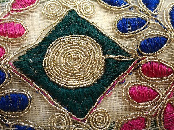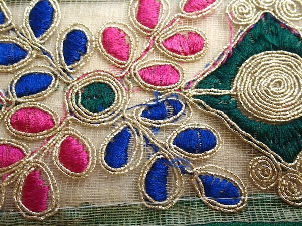 透ける素材に金色のコードと青、緑、ピンクでエスニックな模様が