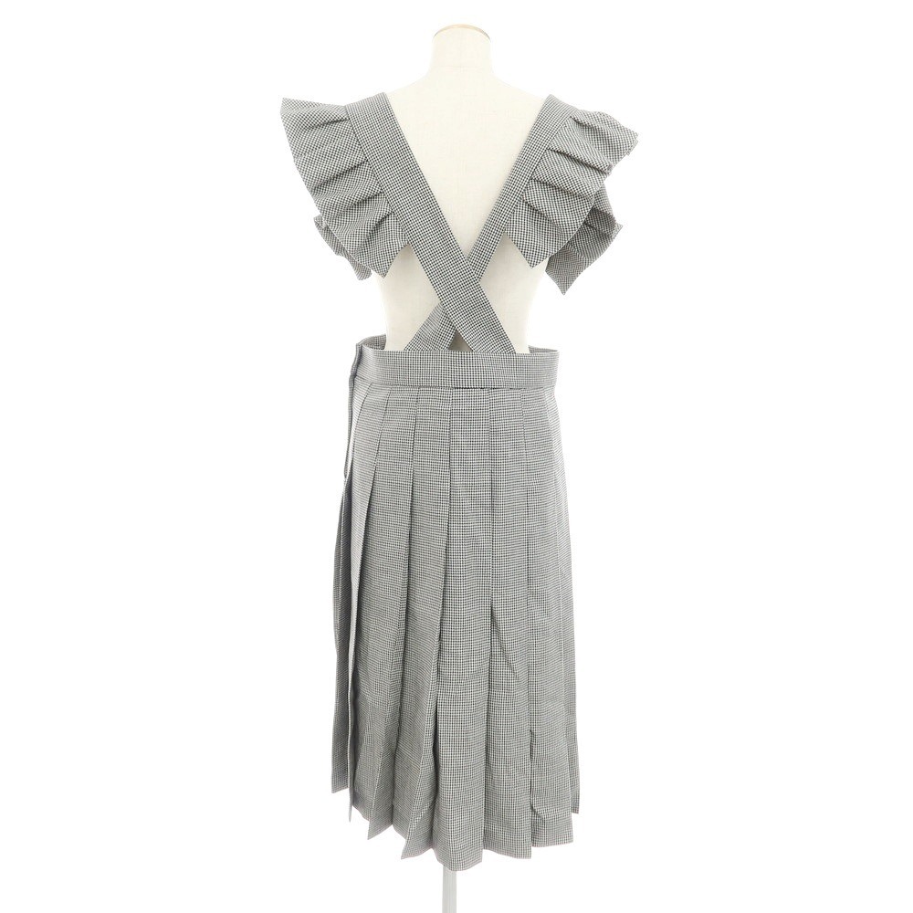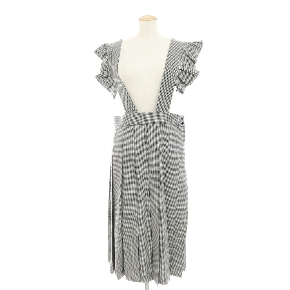 程よく厚みのあるドライタッチなウール生地を使用した、2023年秋冬のハウンドトゥース柄サスペンダースカートです。肩にフリルがデザインされた可愛らしいデザインが魅力的で、程よいボリューム感のプリーツスカートに仕上げられています。