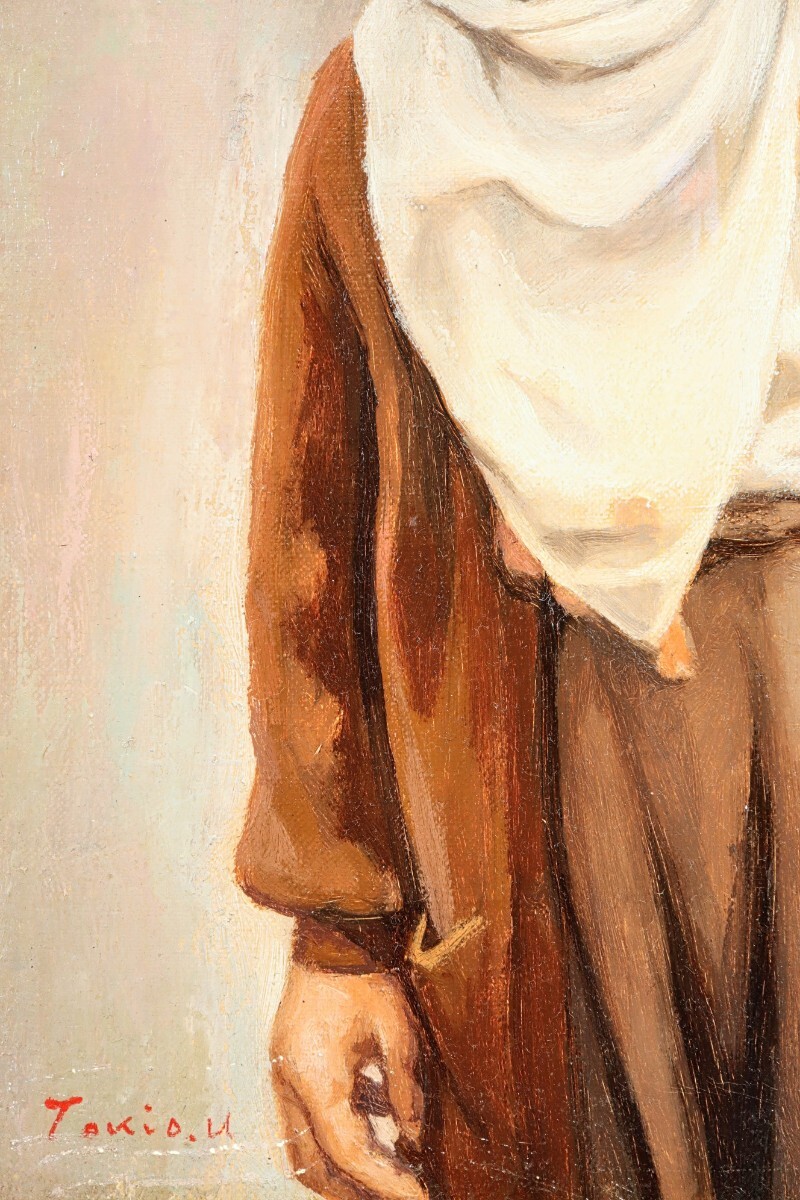 真作 氏家時夫 油彩「トルコの少女」画寸 F6 広島県出身 日本美術会会員 一枚の繪取扱い 恥ずかしげで優しく微笑む可愛い表情の少女 9808