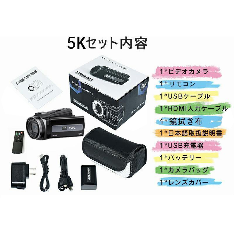 1*ビデオカメラ、1*2.4Gリモコン、1*USBケーブル、1*HDMI入力ケーブル、1*日本語取扱説明書、1*USB充電器、1*バッテリー、1*カメラバッグ、1*レンズカバー。