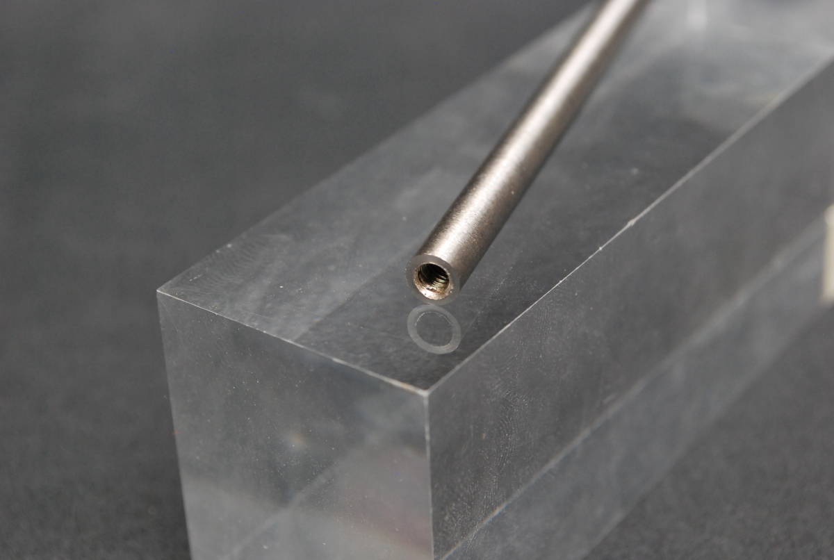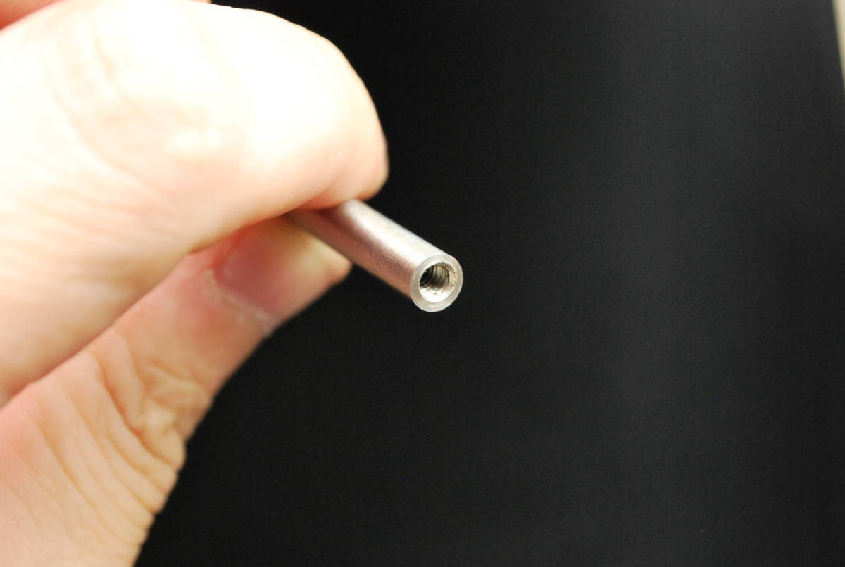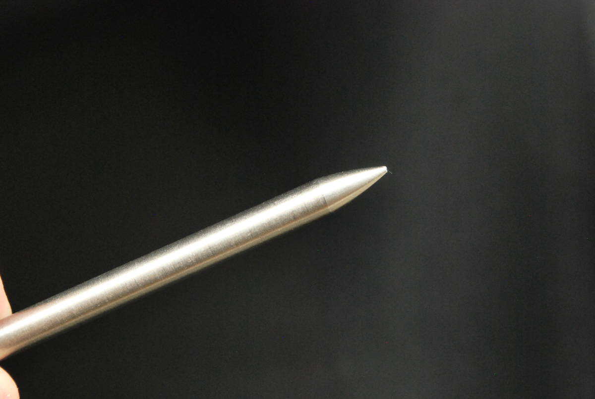 使い方は、斜めにカットしたパラコードの端を火で炙って溶かし細くして冷やします。冷えて堅くなったらカットした部分をニードルの後部の穴にねじ込みながら回していくと、徐々に内側のネジ山に収納され、しっかりと固定する仕組みです。(熱いうちにねじ込んでも固定はされます。)