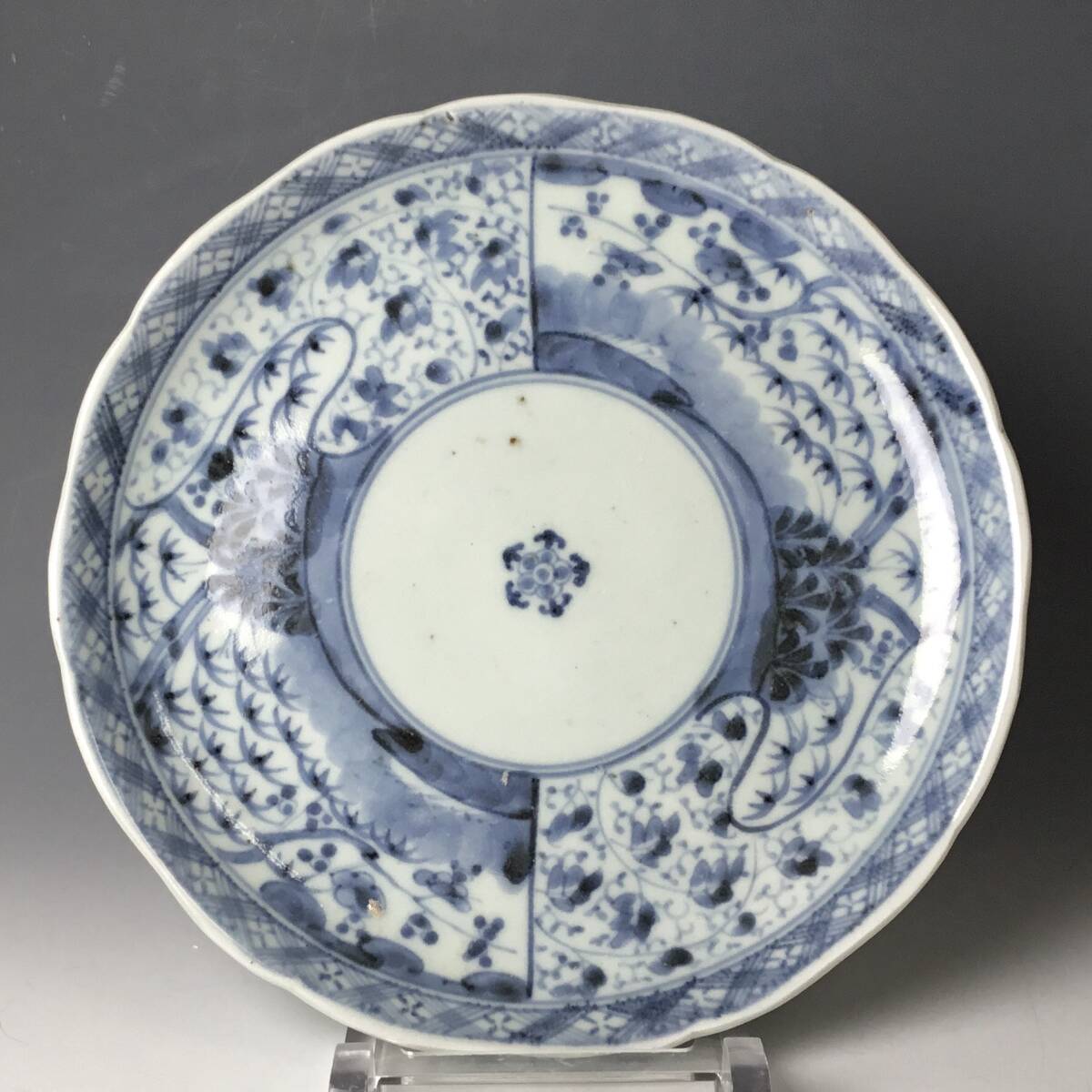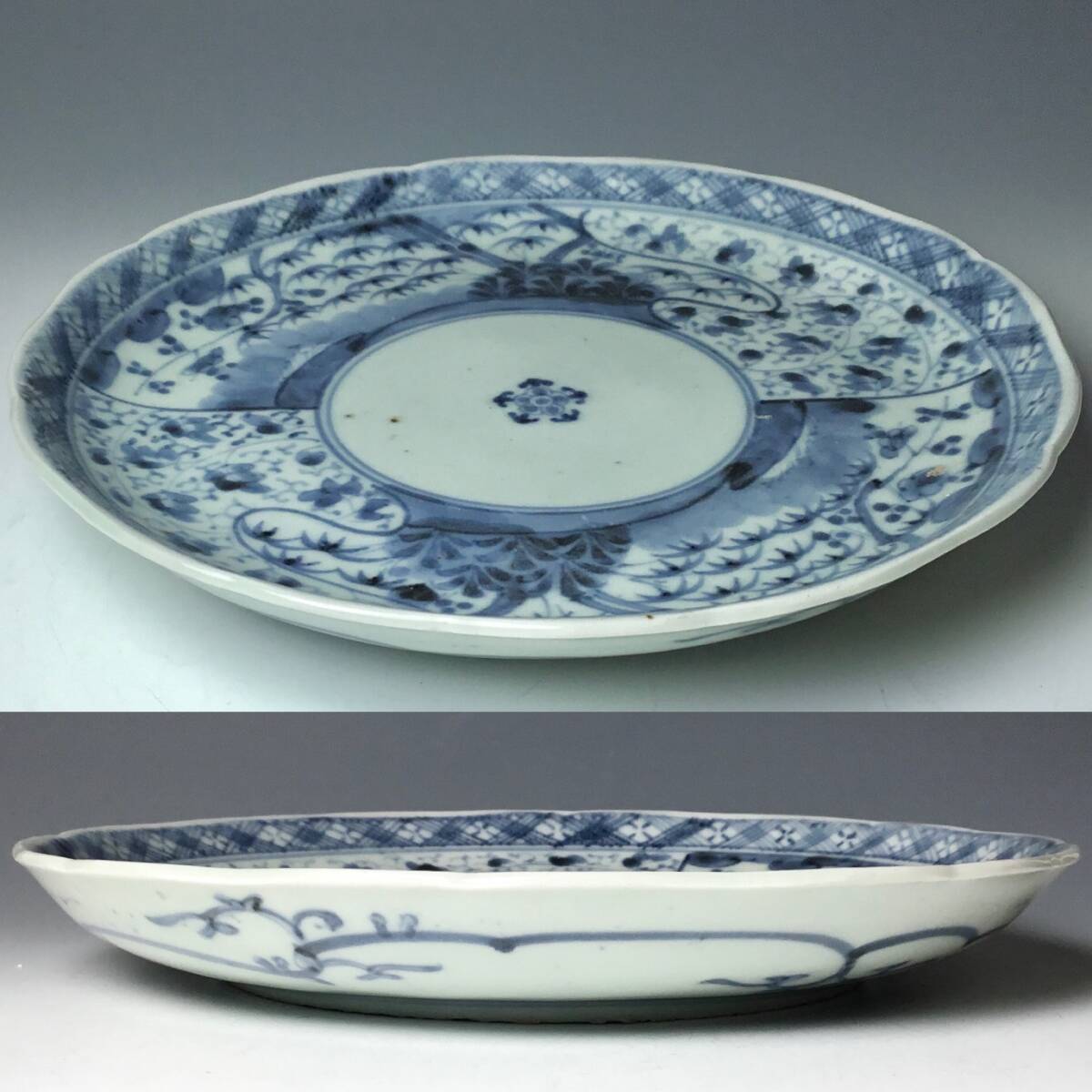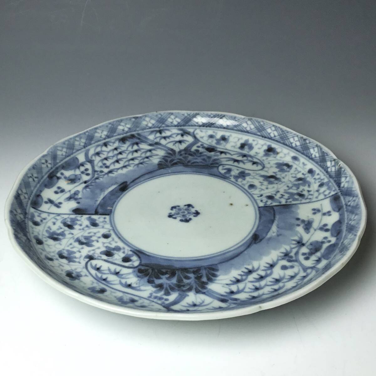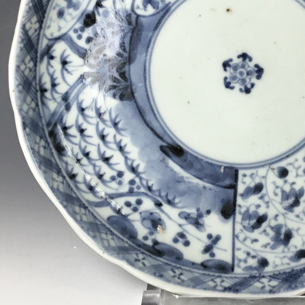 (翔)古伊万里 染付 江戸後期 文化文政期 唐草 松竹梅 輪花 七寸皿 1800年代前後