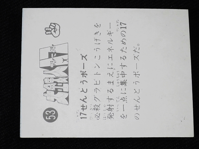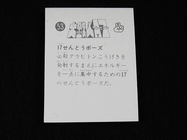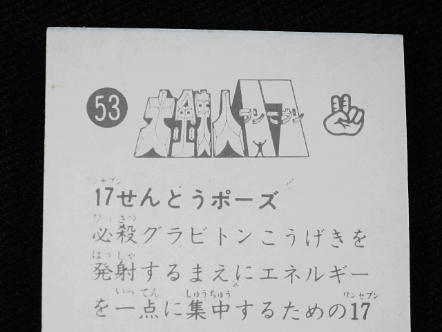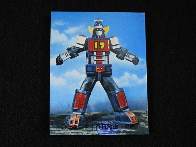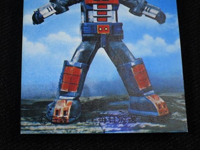 大鉄人 ミニカード バラ売り 1枚 1970年代 ・メーカー:天田 ・サイズ: 6.6 cm x 5.1 cm (裁断により若干誤差有り) ・発売時:1976年頃、当時の放送時に販売 ・構成:全60種シリーズ(1-60番.AL3種) ・発送:〒・各規格のサイズ内、重量内での同梱可能です。 〓参考項目〓 ・原作石森章太郎 ・脚本 伊上勝、上原正三、江連卓、熊谷節、安斉あゆ子 ・監督山田稔、若林幹、内田一作 ・放送局:TBS系列 ・放送期間:1977年3月18日-11月11日 ・全35話 ※出演者 ・南三郎 -神谷政浩 ・佐原千恵 -竹井みどり ・佐原博士 -中丸忠雄 ・剣持隊長 -原口剛 ・村中隊員 - 三井俊吾 ・海野隊員 - 菅野直之 ・小野隊員 - 大槻純子 ・岩山鉄五郎 -高品正広 ・岩山鉄次 -高橋仁 ・岩山エミ - 渡辺麻由美 ・佐原ルミ -島田歌穂 ・キャプテンゴメス -平田昭彦 ・ブラックタイガー -山本麟一 ・チーフキッド -山口あきら ・ハスラー教授 -大月ウルフ ・ピンクジャガー -三東ルシア ・ブルージャガー -太田美緒 ・ブレイン、ビッグエンゼル(声) -水島弘 ・ロボター(声) - 村松美枝子 ・ナレーター、ワンセブン(声) -小林恭治 | ||