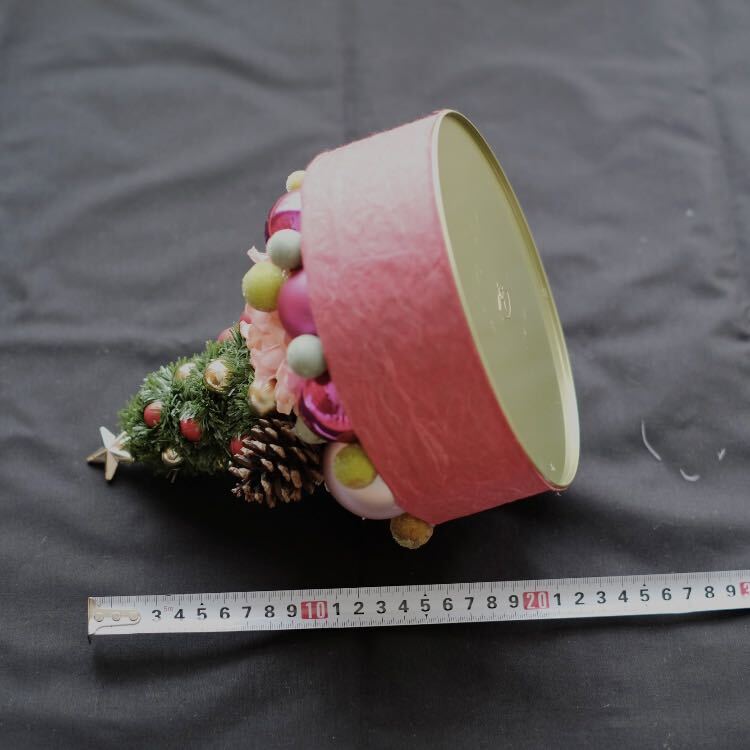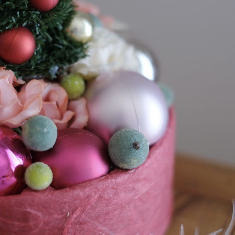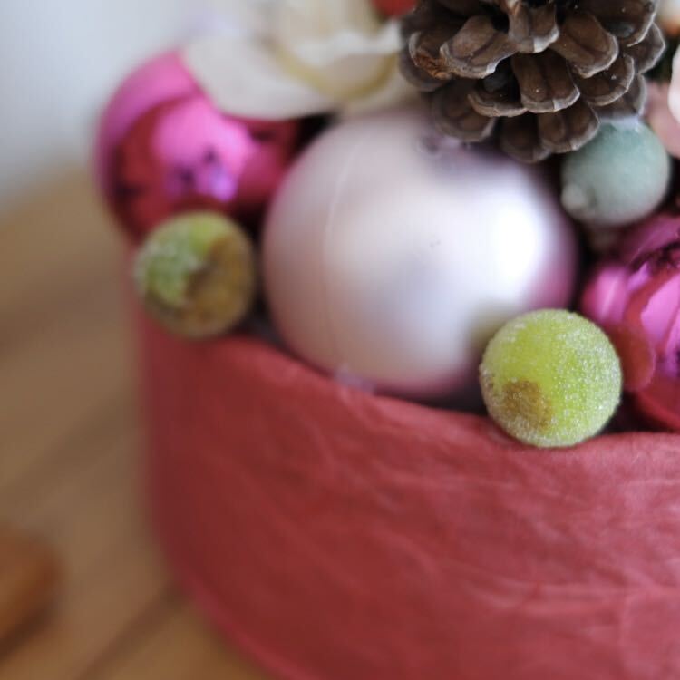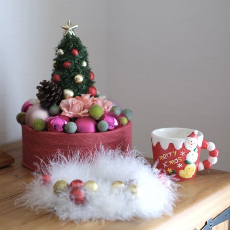 ☆お菓子の缶に和紙・ミニツリー・造花・ボール オーナメント等を使用した ミニツリーの置き飾り
