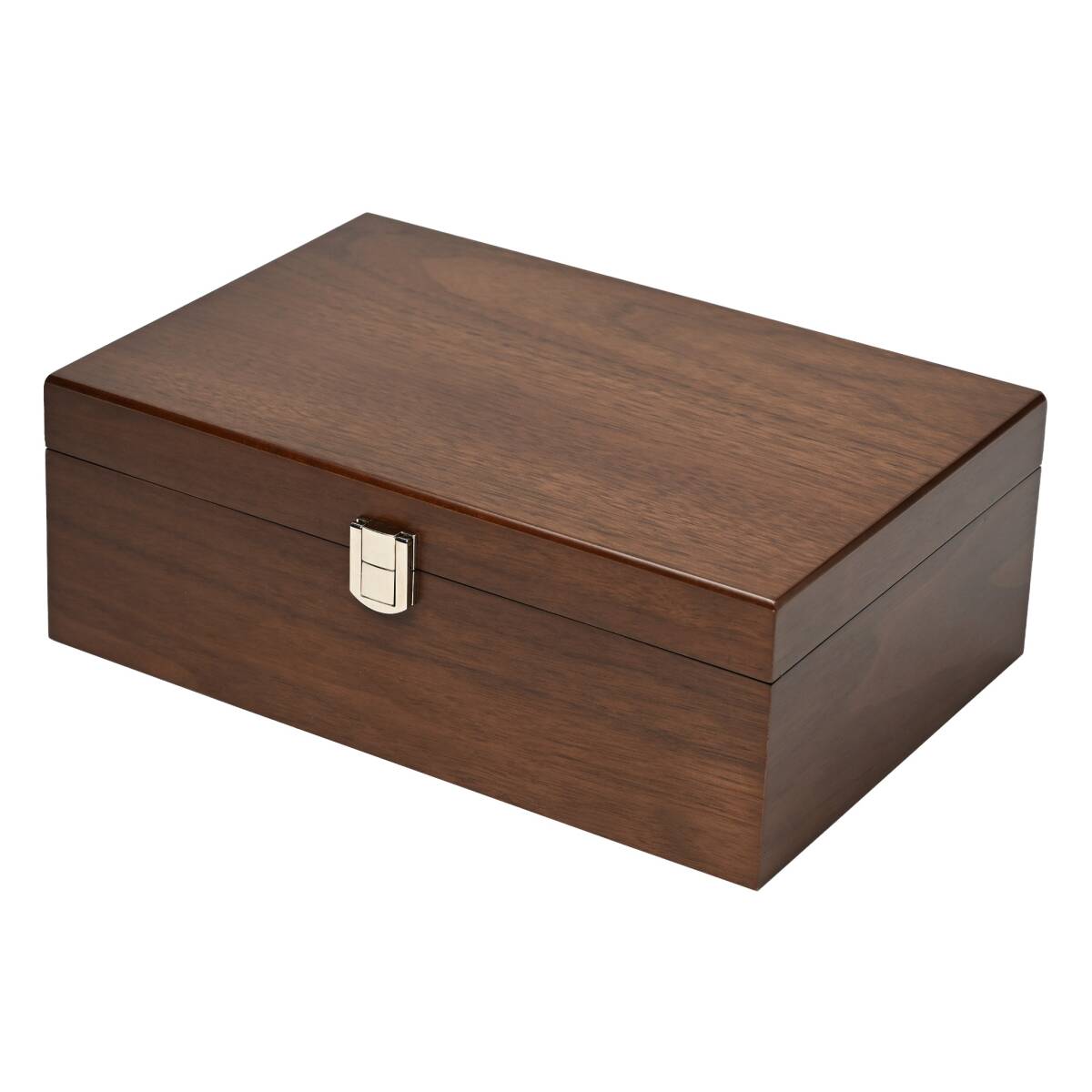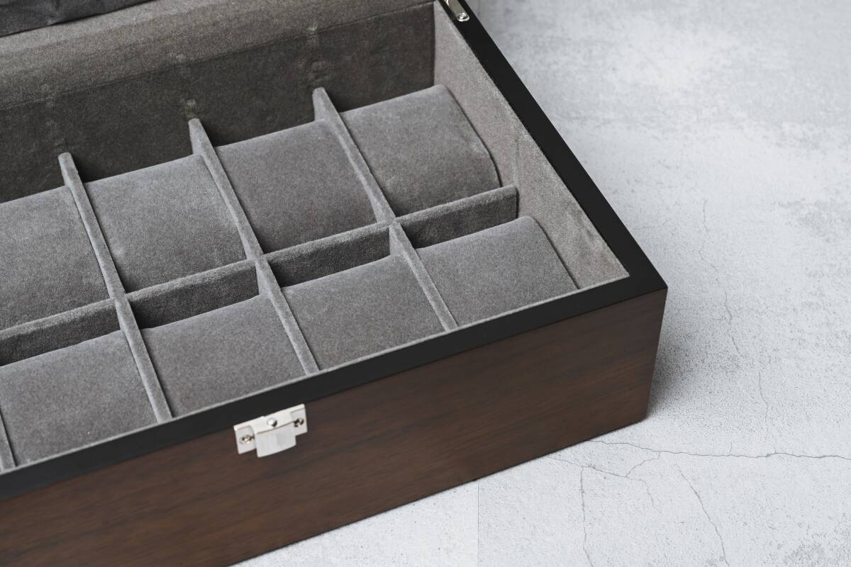 高品質のクルミの木素材を使用した10本用時計ボックスは、洗練されたデザインと機能性を兼ね備えています。その本体は深さのある容量を持ち、10本の時計を美しく収納できます。窓のないデザインは、外部の光やダストから時計を守りながら、内部のプライバシーを保護します。さらに、収納ポケットが付いており、時計以外の小物やアクセサリーを整理して収納することも可能です。クルミの木の温かみと質感が、この時計ボックスに豪華さと高級感を与えます。取り外し可能なクッションは、時計の保護と取り扱いの便利さを両立させています。本格的な職人技術により作られたこの時計ボックスは、耐久性と品質に優れており、長い間ご愛用いただけます。腕時計のプレゼントとあわせて収納ケースも是非プレゼントに!