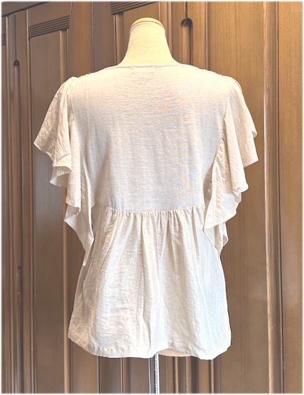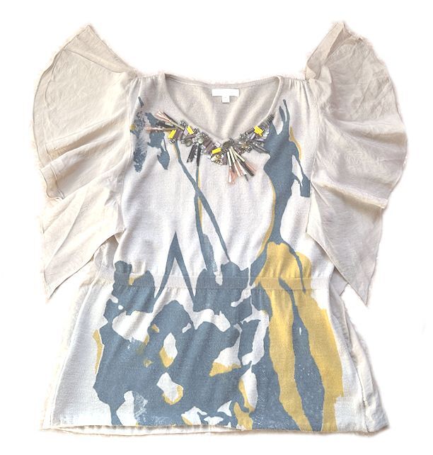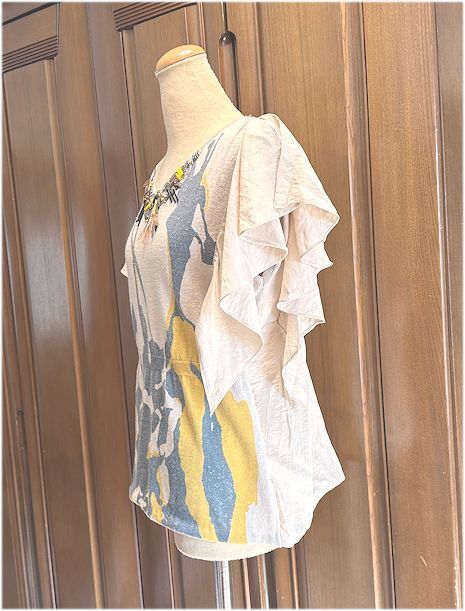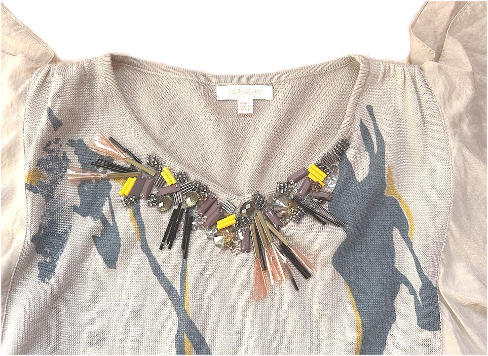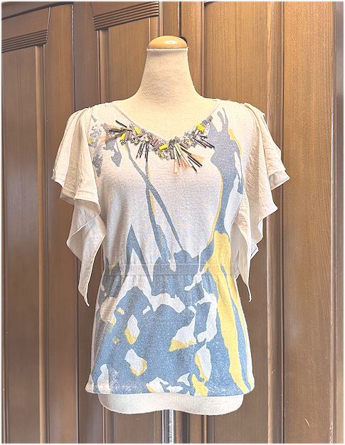 ◎たくさんの色々なビーズで胸元を華やかに彩った、素敵なニットです。袖と後ろ身頃の下部は布帛クレープ素材でフレア状にしており、ひらひらと広がり綺麗です。とっても素敵で貰ってきましたが、サイズ感の関係で着ておりませんでした。大人エレガントなコーディネートに、ぜひいかがでしょう★