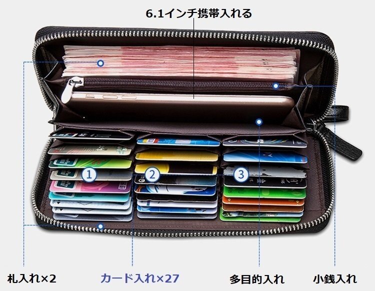 ・カード入れ×27 ・札入れ×2 ・多目的収納×1 (6.1インチ携帯入れる)