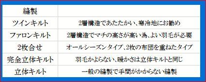 ② 羽毛の量   シングルで1.2kg以上 但しダウン比率により違います、下記表をご参考にして下さい。