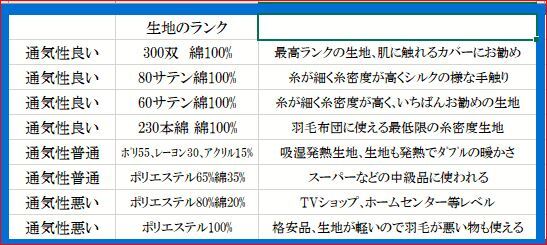 綿100%生地がお勧め、綿生地は重い為、質の悪い羽毛はふっくらしない為、ダウン90%