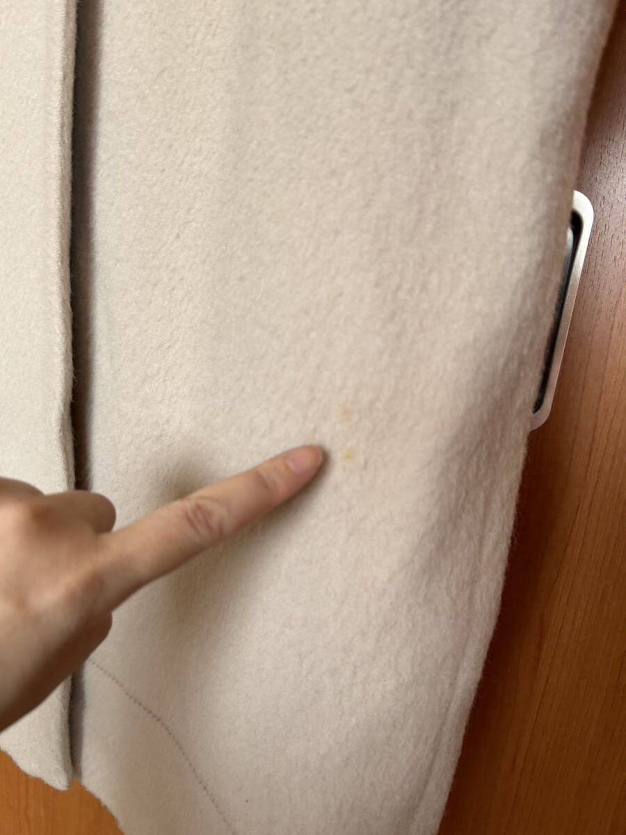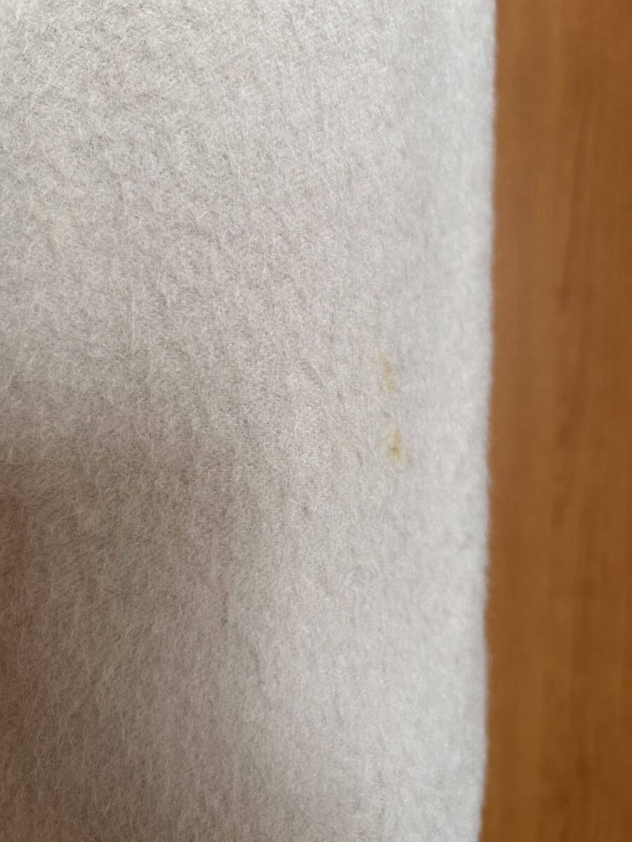 クリーニングに出して保管していましたが、経年劣化のためか、左膝付近に黄色っぽいシミのようなものができていました。