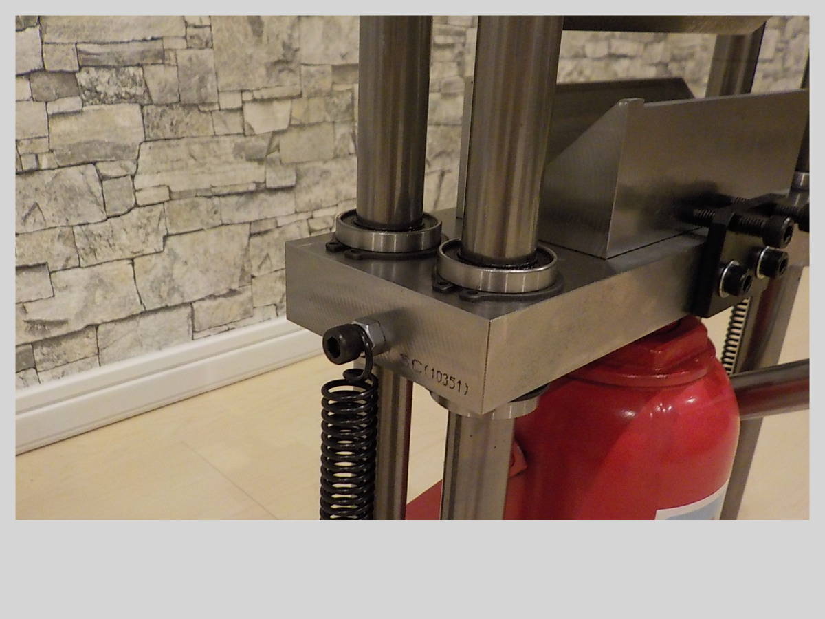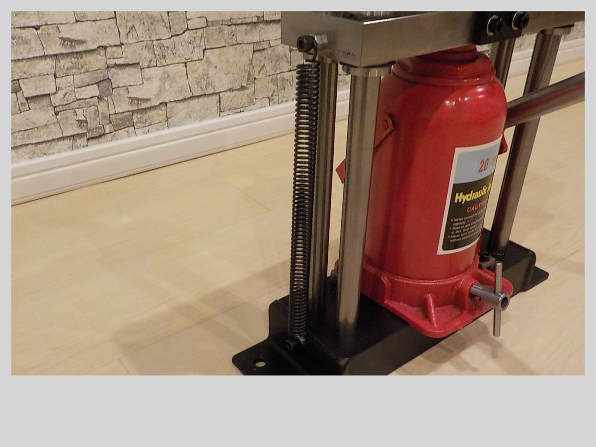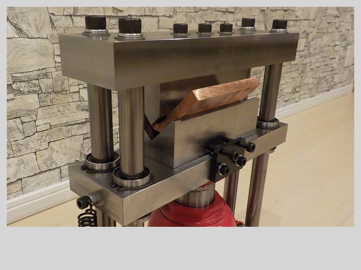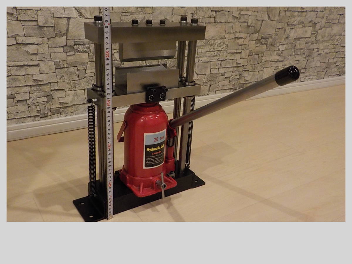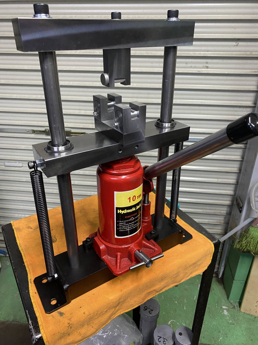 油圧式20Tonメタルベンダー製作の要望があり完成致しました。アングルなどを溶接したような物とは違い当方のメタルベンダーは、シャフトとリニアブッシュを使用しておりスムーズに上下します。ジャッキ本体は、中国製で本当に20Tonの能力があるか疑問ですが、今回、厚み:10ミリ、幅:100ミリの銅板を曲げて検証済みです。画像の上型(厚み:20ミリ、幅:140ミリ、高さ:50ミリ)下型(厚み:45ミリ、幅:140ミリ、奥行:60ミリ、V溝幅:約50ミリ)は今回のワークを曲げるための特注品です。標準装備は、上型(厚み:15ミリ、幅:140ミリ、高さ:50ミリ)下型(厚み:32ミリ、幅:140ミリ、奥行:32ミリ、V溝幅:約26ミリ)です。上型、下型もS50C相当の材料をフライス加工で製作しております。リリースバルブハンドルやスプリングの使用で作業がスムーズに進みます。上型、下型は取り外し式なので、プレスやベアリングの圧入などにも使用出来ます。画像6以降は、16ミリ丸棒を曲げる金型を装着しております。こちらもオプションで上型、下型セットで18000円です。上型の刃先は硬質素材を使用しております。下型の台座には可動するコマが装着されており曲げる時の負荷が軽減されてスムーズに曲げる事が出来ます。 その他に希望の用途や金型の製作があれば、ご相談下さい。納期は10~14日です。ヤフオクのシステム上、7日位で発送の催促通知が来ますので、先に発送通知を送らせて頂きます。この点をご理解の上、落札願います。発送は着払いで行いますので、オプションが無い場合、送料連絡は0円で通知致します。 受注が混み合っております。納期を確認してから落札して下さい。 サイズ 幅:約370ミリ 奥行:約170ミリ 高さ:約460ミリ 重量:約29㎏ 納期は10~14日です。ヤフオクのシステム上、7日位で発送の催促通知が来ますので、先に発送通知を送らせて頂きます。この点をご理解の上、落札願います。発送は着払いで行いますので、オプションが無い場合、送料連絡は0円で通知致します。受注が混み合っております。納期を確認してから落札して下さい。重量物の発送となりますので、伝票に記入するため電話番号をお知らせ下さい。 支払い、配送宜しければ、私の秘密基地もご覧下さい。秘密基地