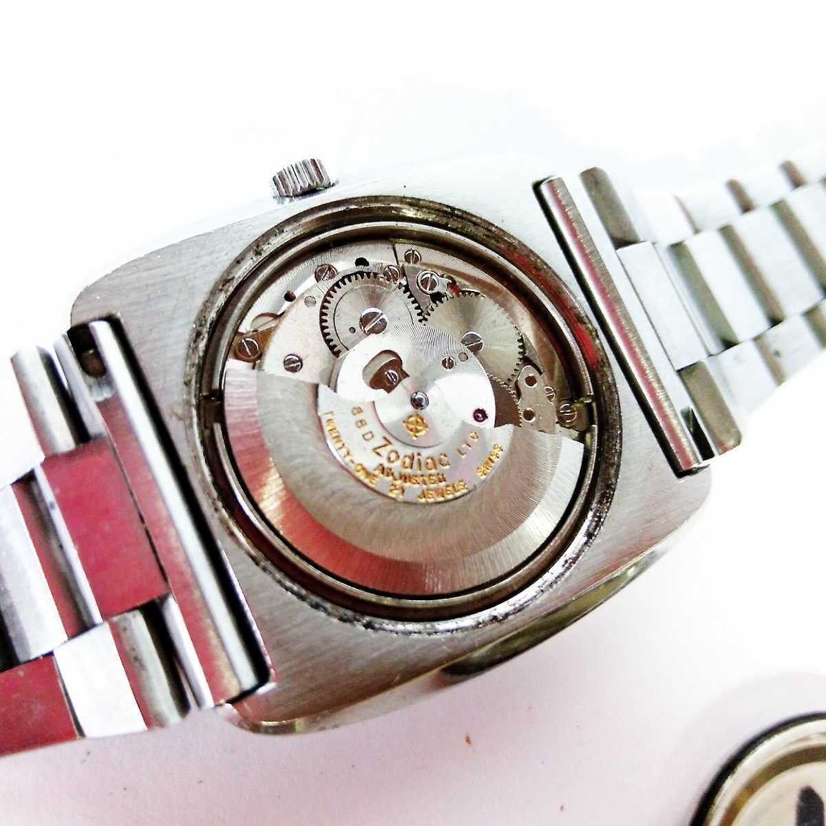 スイスの高級時計ゾディアックの自動巻きです。赤い丸が秒針として機能しており、振ると外周を動いております。 りゅうずを引いて回しましたが針が動きません。修理前提のジャンクとしての出品となります。 バンドは純正です。 ケース横幅りゅうずを含めて約37ミリです。 手巻き式はねじを巻き、自動巻き式は振ることで稼働を確認しております。 細かい日差等は機器がなく計測できておりません。 出たままなので、実用をお考えの場合、メンテナンスをお勧めします。 現状品としての販売となります。 落札後のキャンセル、到着後の返品は承っておりませんので、よろしくお願いいたします。 当方では領収書の発行はいたしておりません。 また、ご落札後に発送方法の変更交渉等ありましても対応いたしかねます。 実際の送料とお支払いいただいた金額に差がございましても、 追加請求、返金はいたしませんのでご了承くださいませ。 動作状況や状態は出品時のものになります。 輸送中など、状態に変化がございましても責任を負いかねますのでご了承ください。 輸送中の破損や故障につきましても 対応いたしかねますのでご了承くださいませ。 また、間違いのないように気をつけてはおりますが、タイトルや説明文と商品画像に矛盾がある場合、画像の商品を発送するということでご了承の上入札をお願いします。状態、ブランド、メーカー、個数など、なにか表記ミスがあったとしても画像の商品を送る以上のことはいたしませんのでご了承くださいませ。