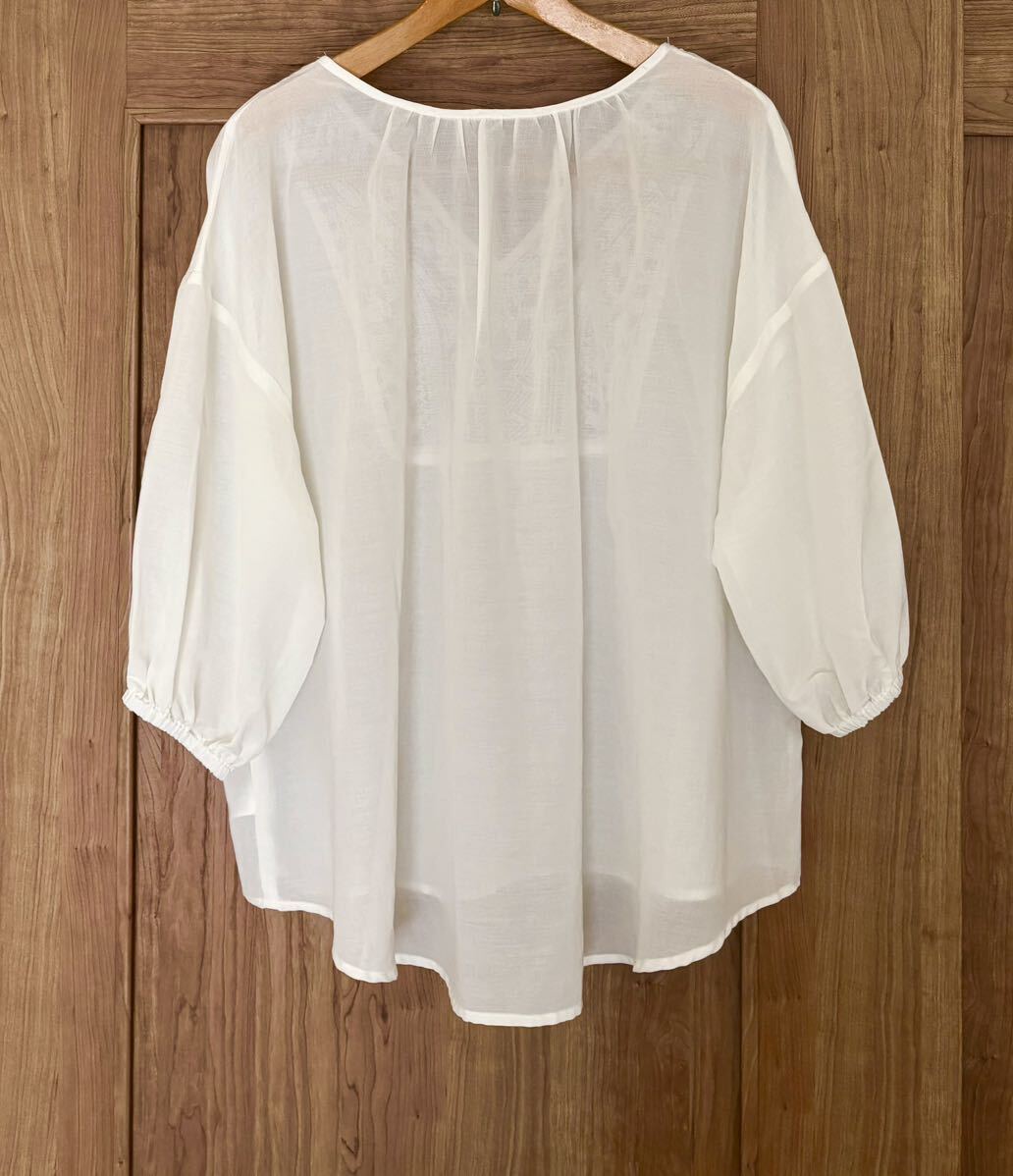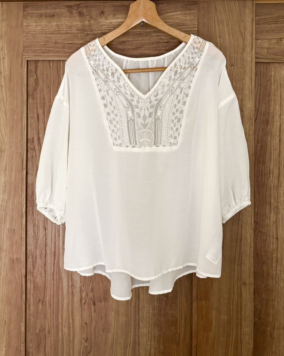 胸元の刺繍レースがエレガントなブラウス。キーネックのスリットがさりげないヌケ感を演出。袖口を絞ったふんわりとしたスリーブもフェミニンな印象です。ほんのり透けるシアーな素材感が旬な装いを叶えてくれるアイテム。