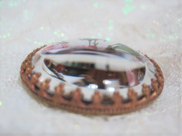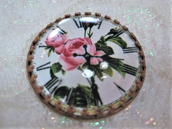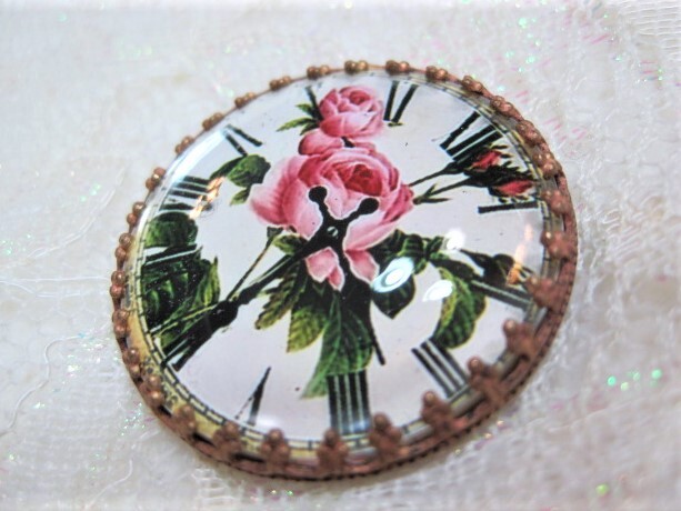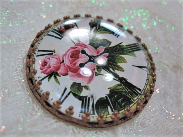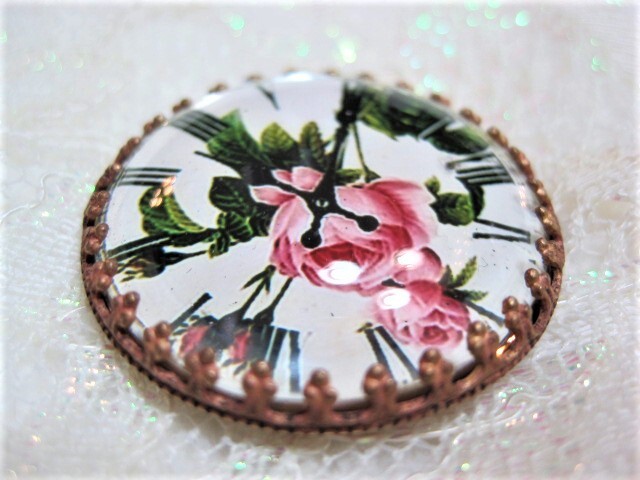 刻印★チェコ■薔薇の花時計 クリスタルドームガラスボタン メタル台 約3.2㎝ G-13990 アンティーク