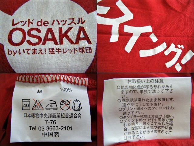 本体は綿素材。     前面フロントと背面バッグに絵・文字がプリントされたレッド DE ハッスル OSAKA 応援Tシャツ・コットンシャツ。        “ NPB   KINTETSU BUFFALOES PROFESIONAL BASEBALL TEAM ”      当選懸賞非売品          カラー  RED