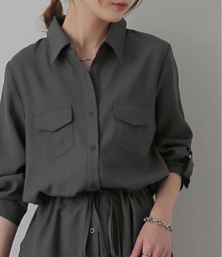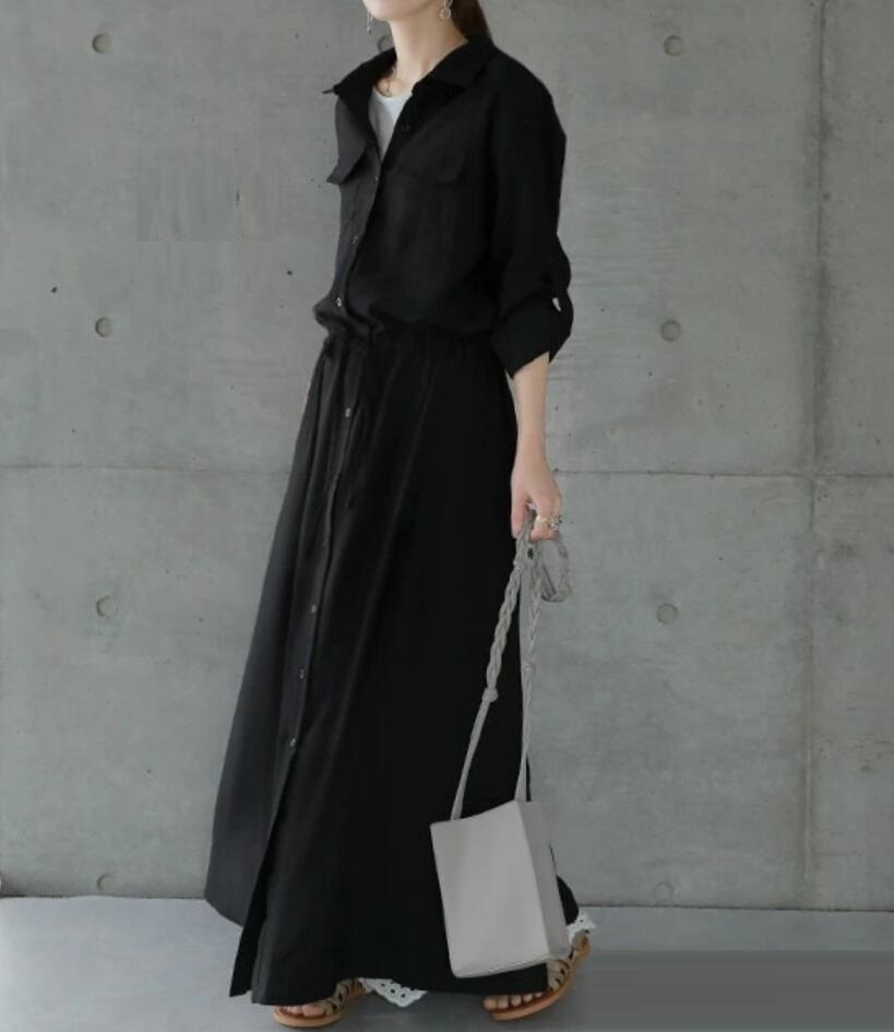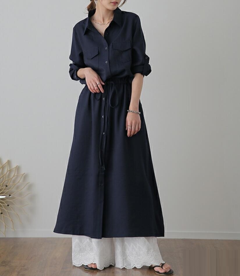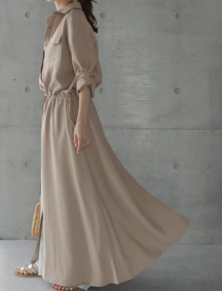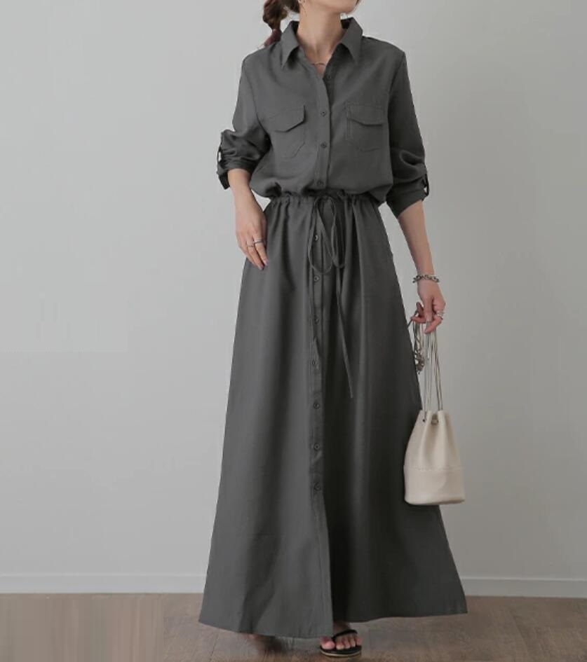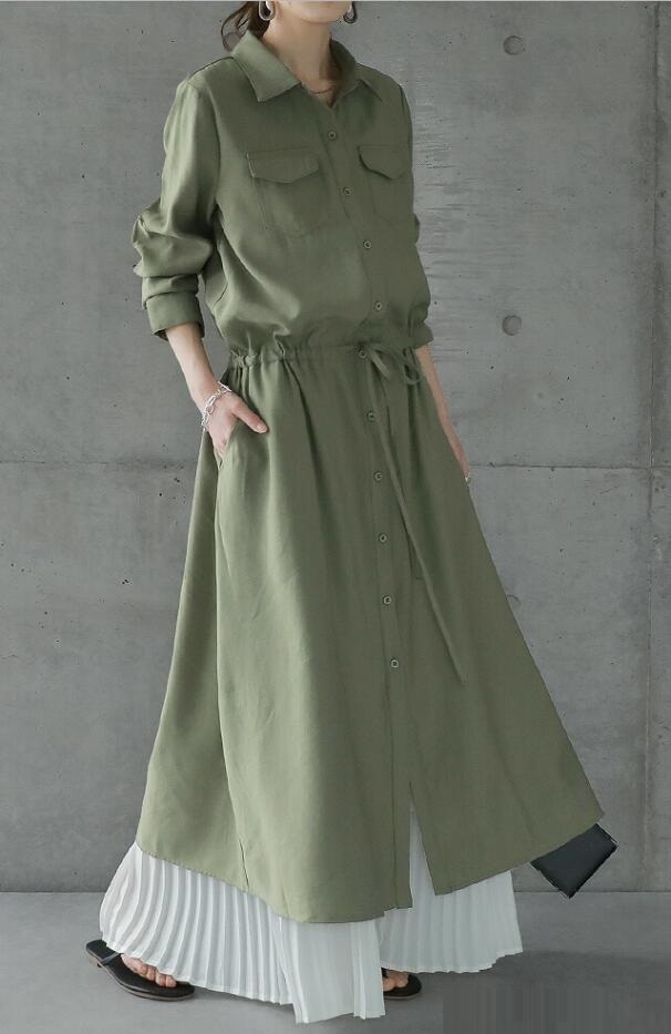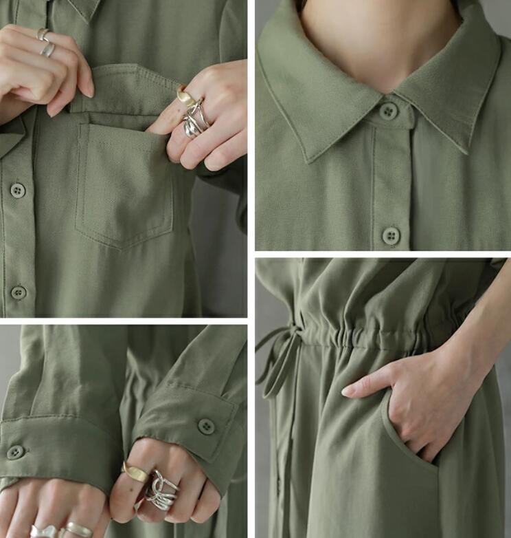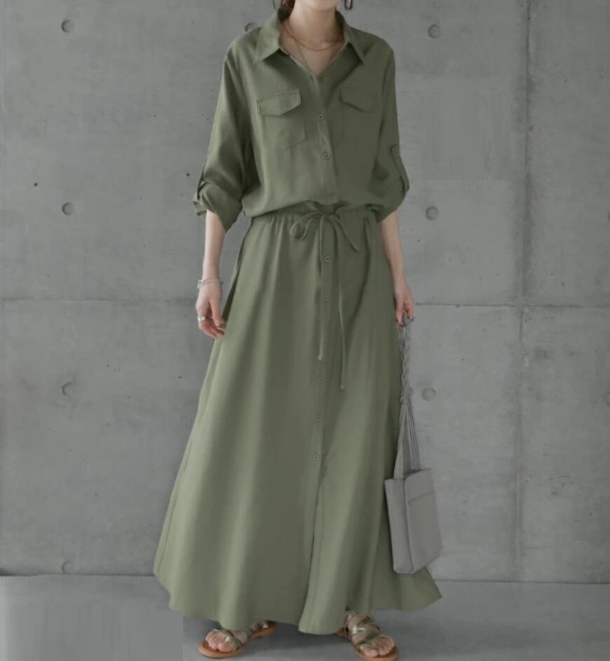 秋新作~カジュアル ワンピース レディース 長袖 ロングワンピース シャツワンピース お洒落 マキシワンピース~緑