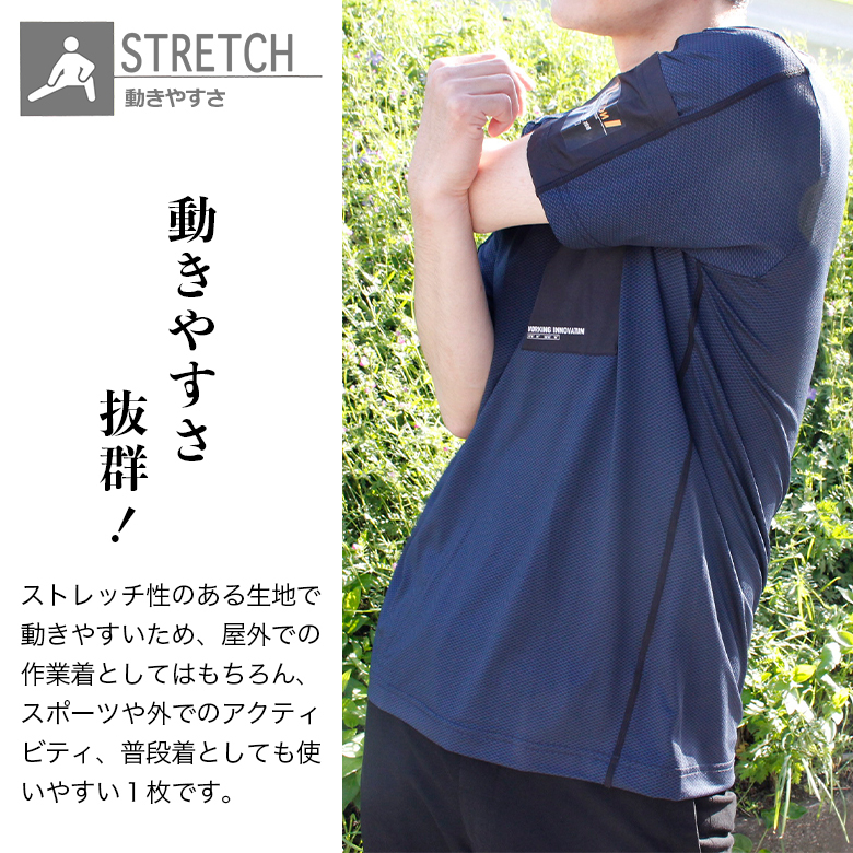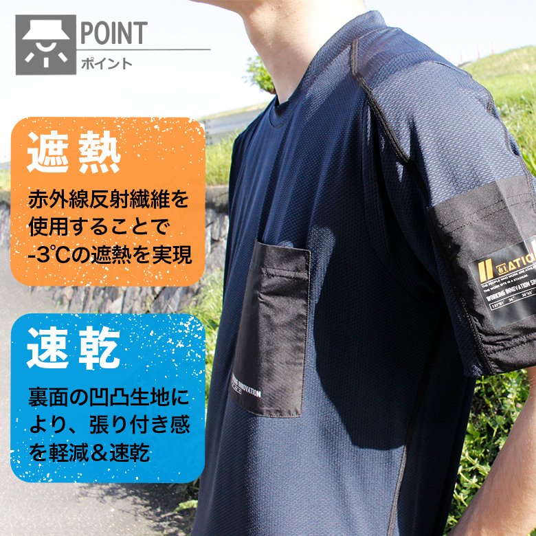 特殊鉱石を繊維に練り込み、遮熱製向上。生地表面を凹凸状にさせ、肌への設置面積を減らし、汗の拡散を促進。