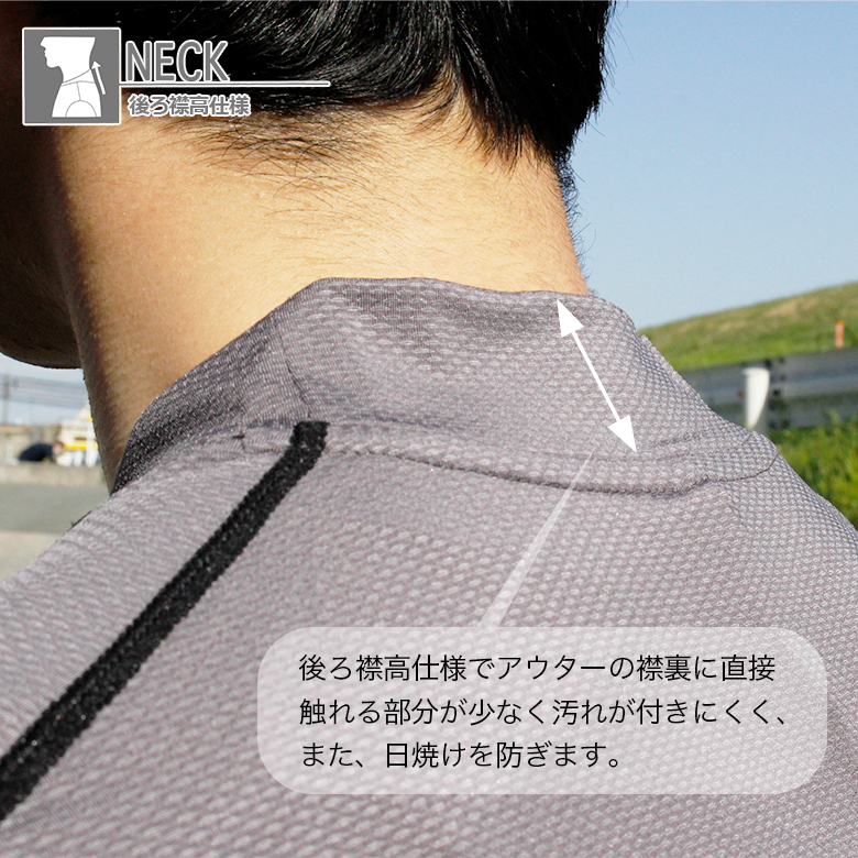 首の襟高で上着の首元スッキリ、日焼け防止。