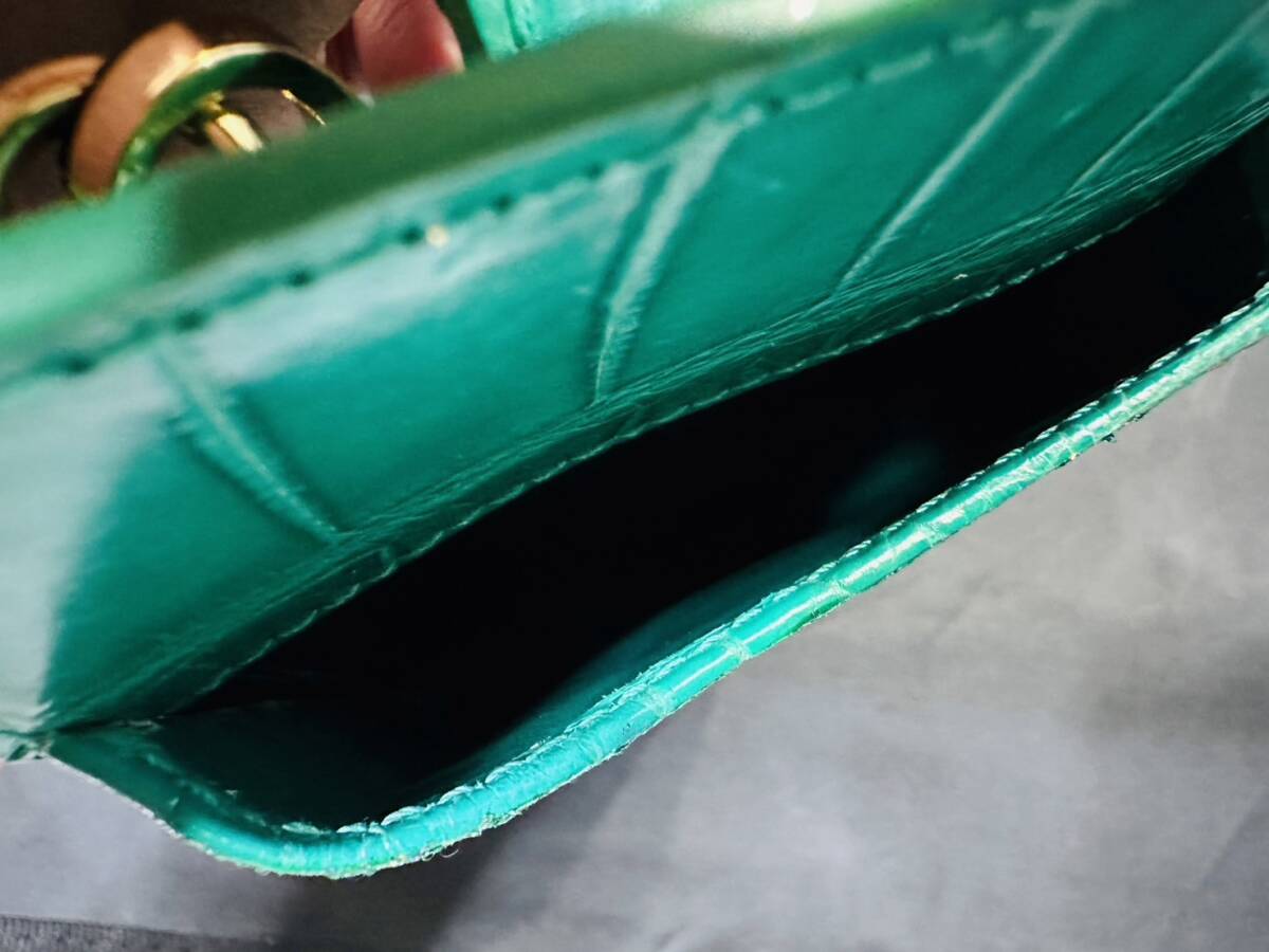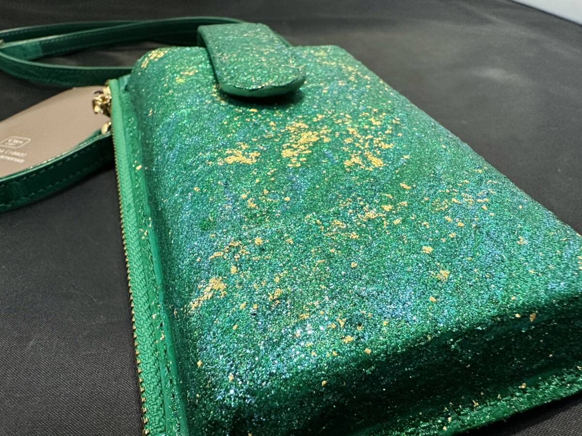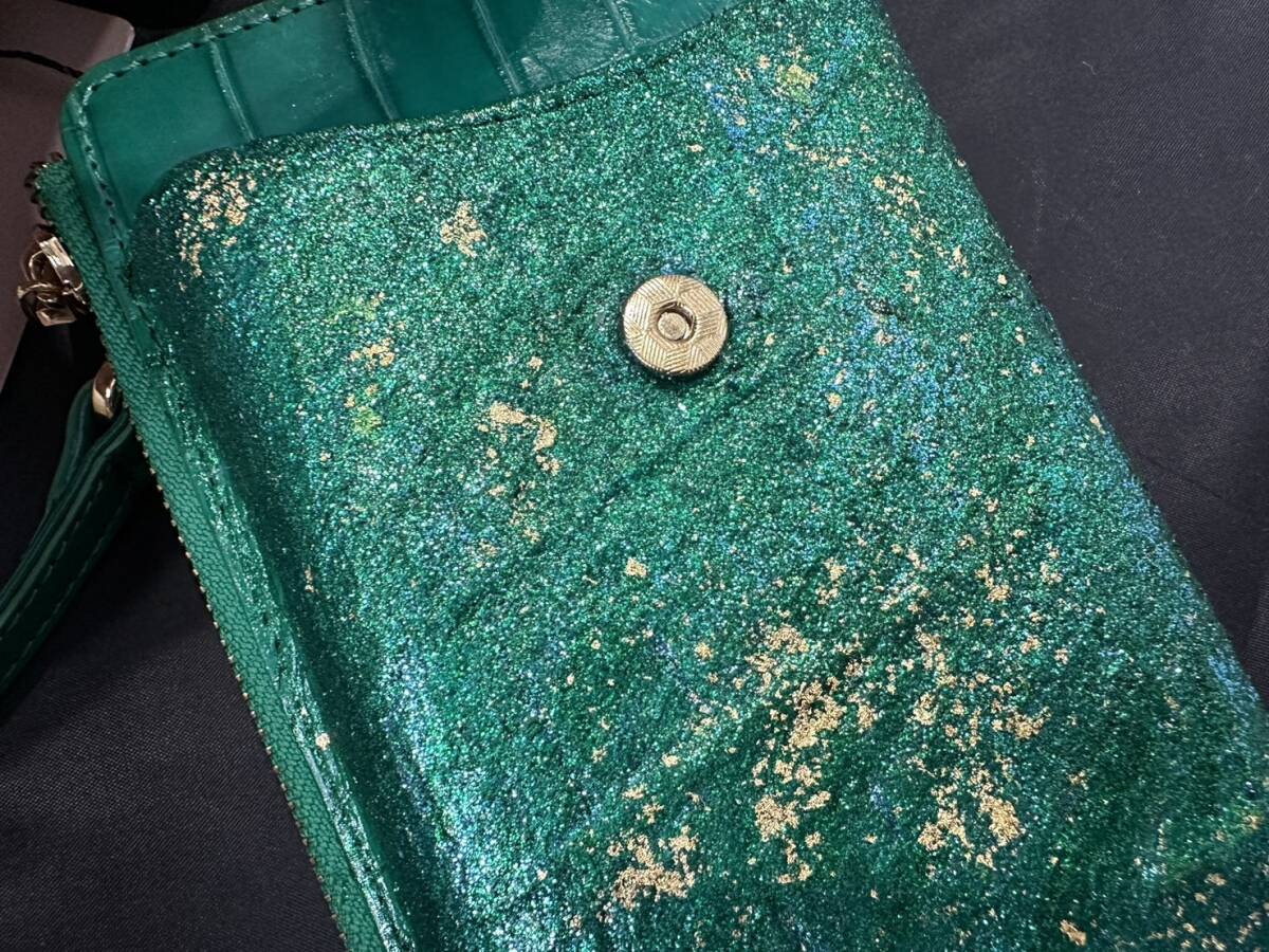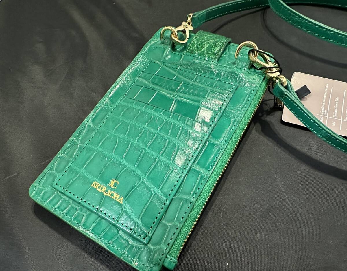 新品未使用<金運UP クロコダイル>K24 純金箔 付き エメラルド スマホ ショルダー レザー クロコ スマートフォン ケース バッグ グリーン