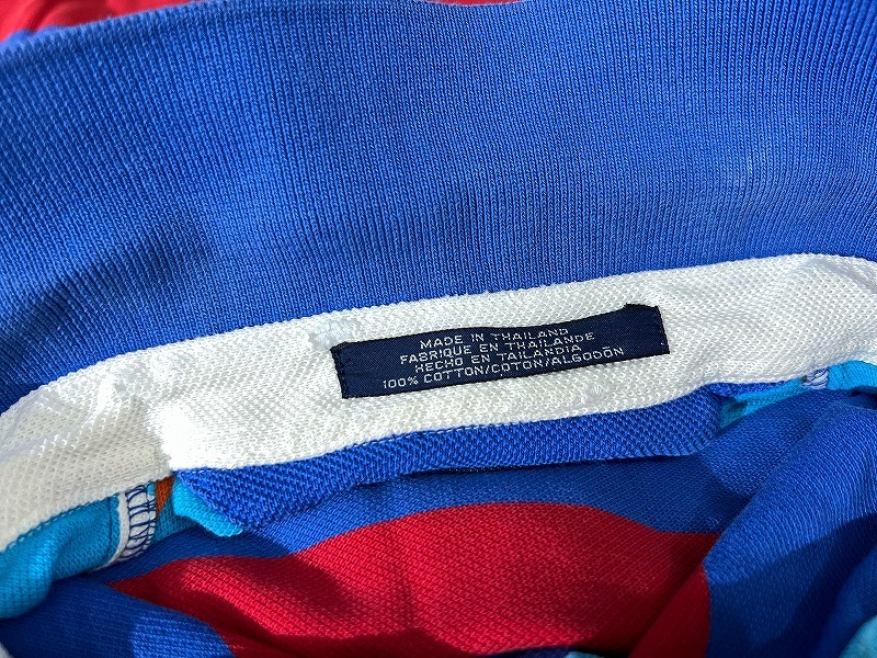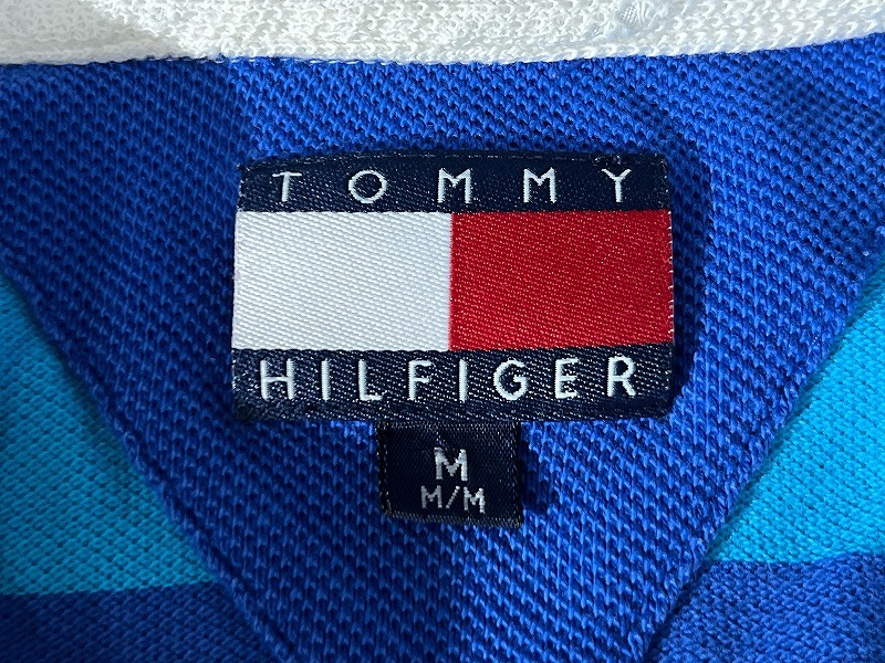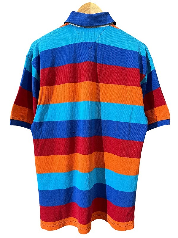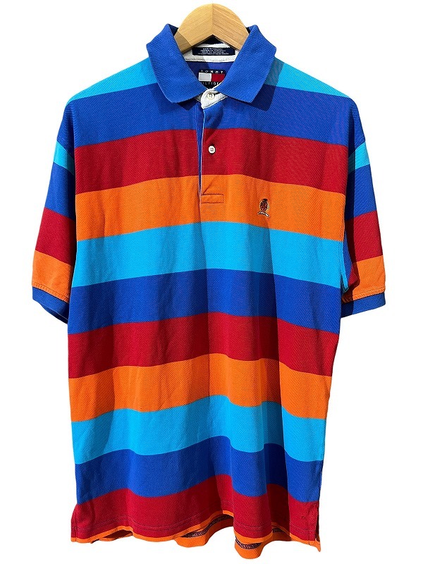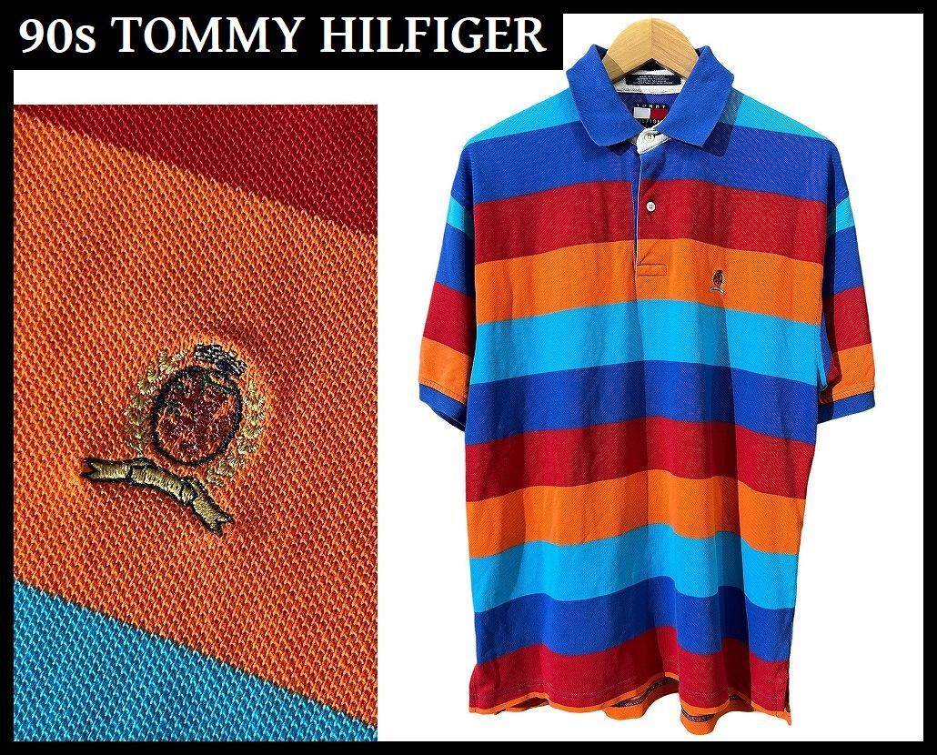 送料無料 G② 古着屋購入 90s TOMMY HILFIGER トミーヒルフィガー フラッグタグ 刺繍 エンブレム ロゴ マルチ ボーダー 半袖 ポロシャツ M