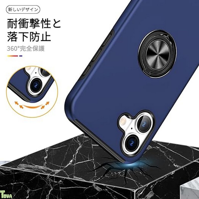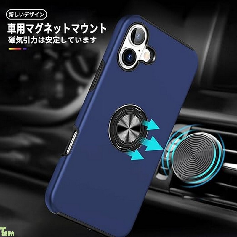 ブルー ガラスフィルム付 TPU + PUレザー リング付 マグネット式車載スタンド対応 シェル iPhone 16 Plus 保護 バンパー ケース カバー