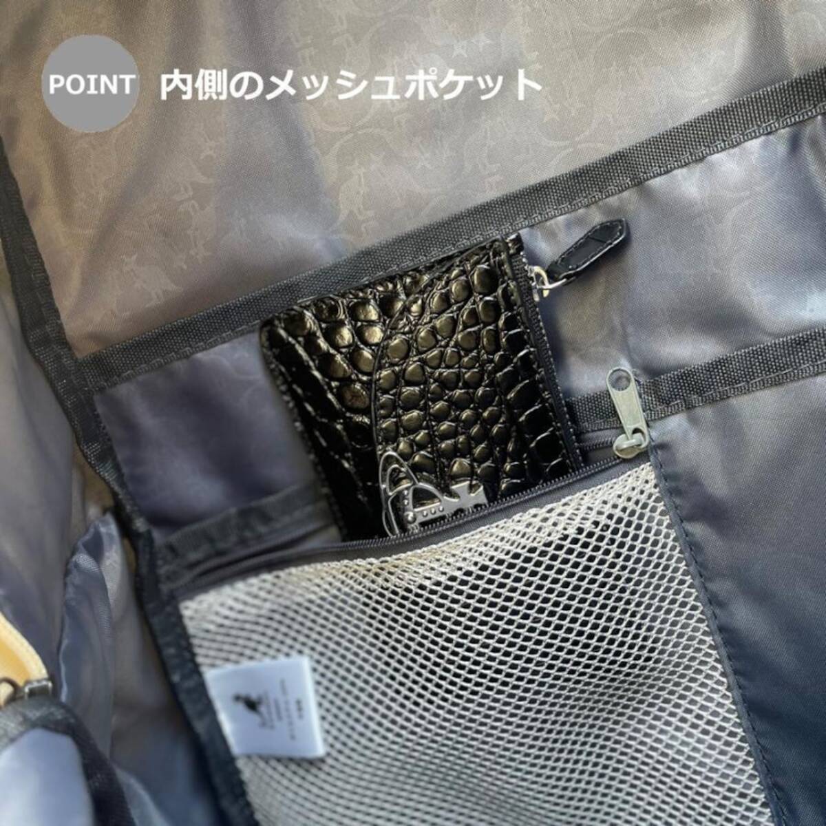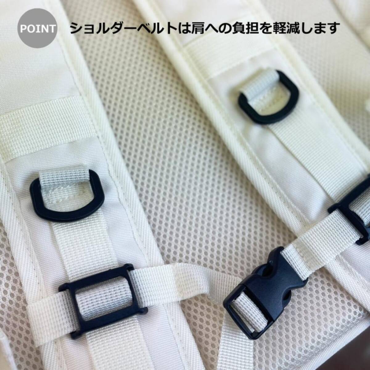 背面はメッシュ加工で蒸れにくく、ショルダーベルトは肩への負担を軽減します。