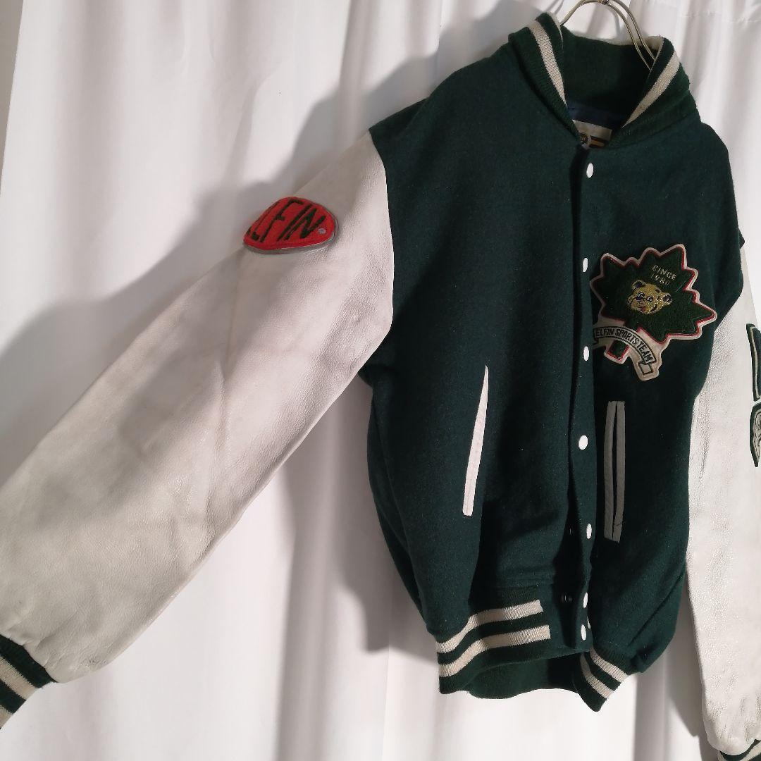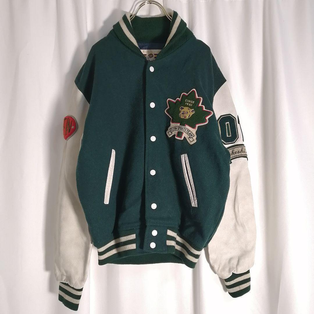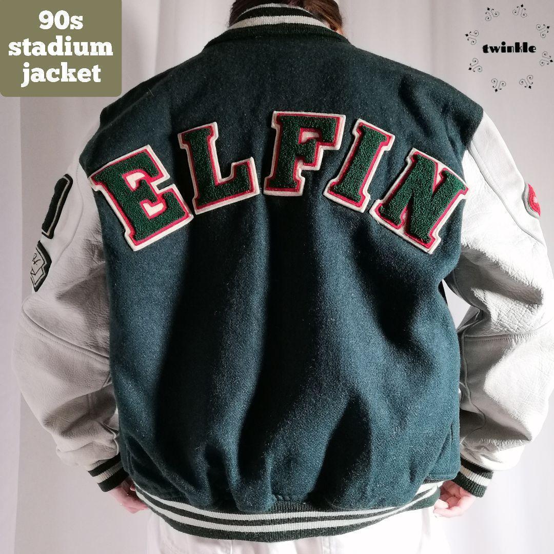 古着 日本製 90s 90年代 ヴィンテージ 袖レザー ウール スタジャン アワードジャケット グリーン 緑 ユニセックス L ビンテージ N542