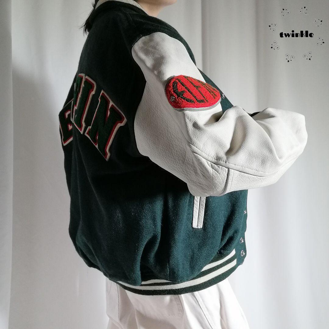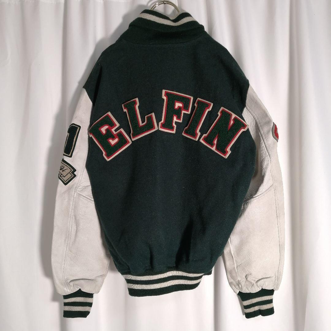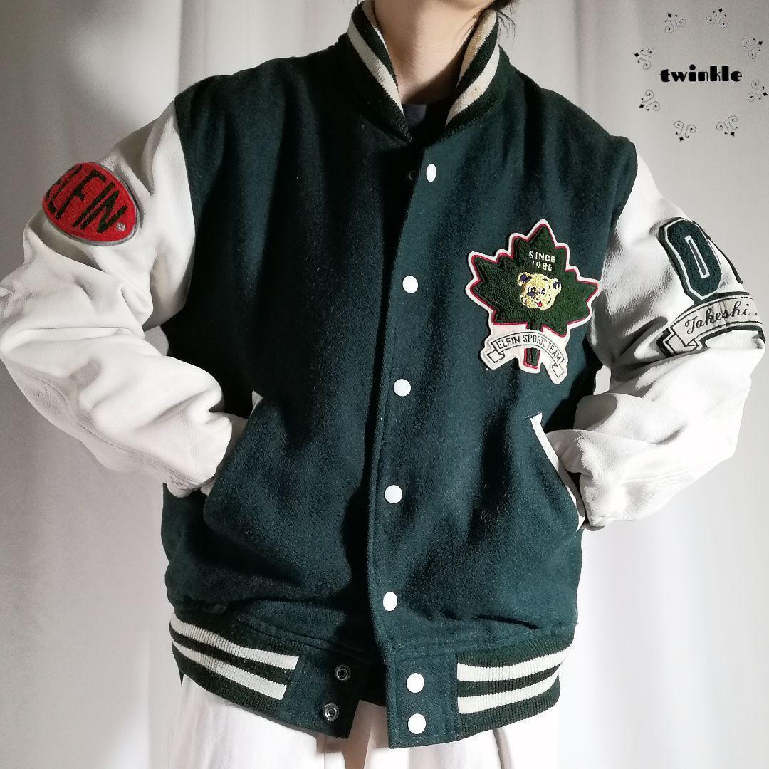 古着 日本製 90s 90年代 ヴィンテージ 袖レザー ウール スタジャン アワードジャケット グリーン 緑 ユニセックス L ビンテージ N542
