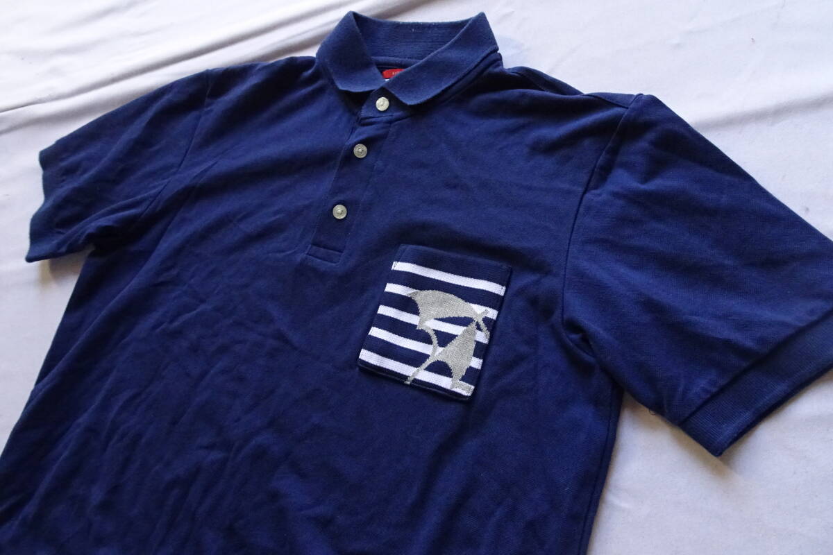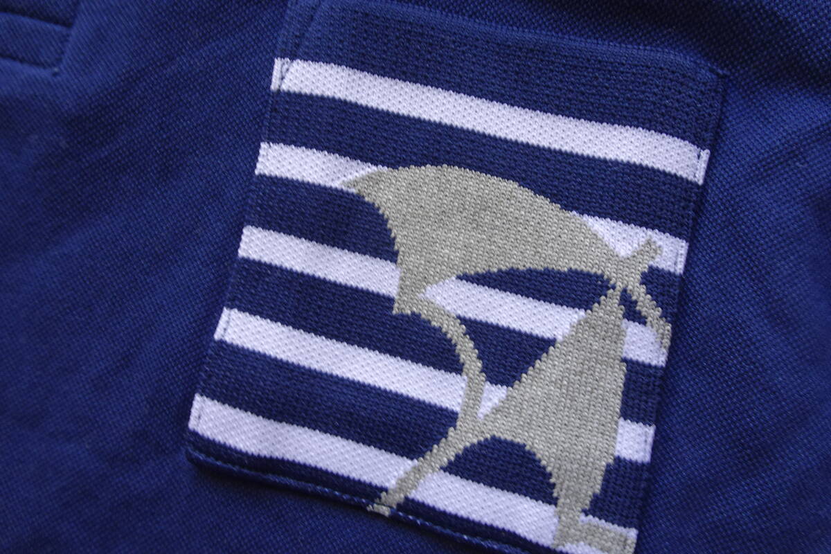 紺、白のボーダー柄で、ブランドロゴイラスト入りのポケットです。