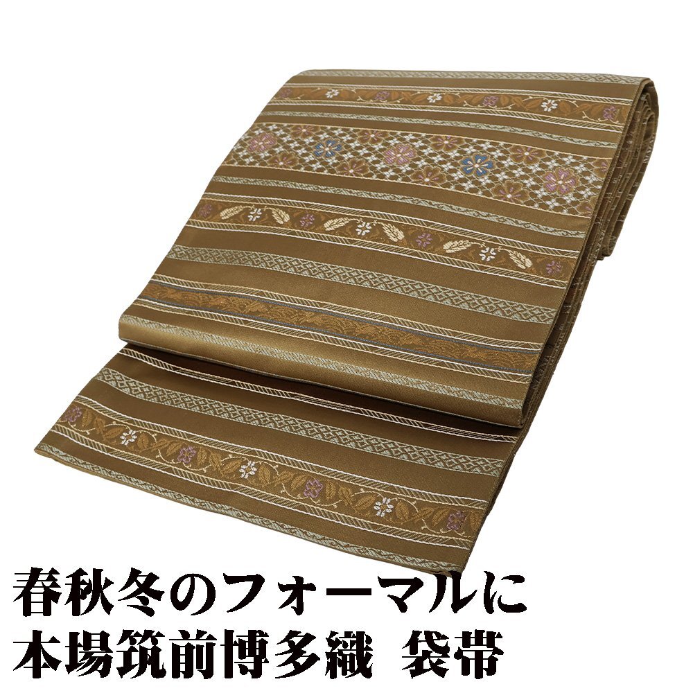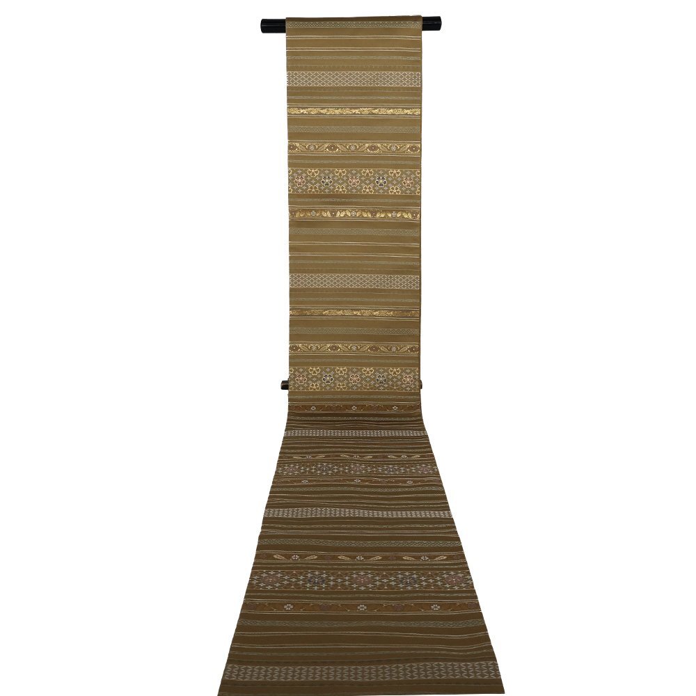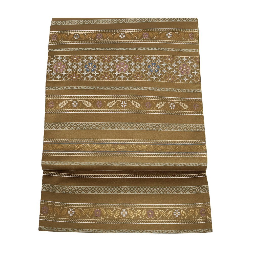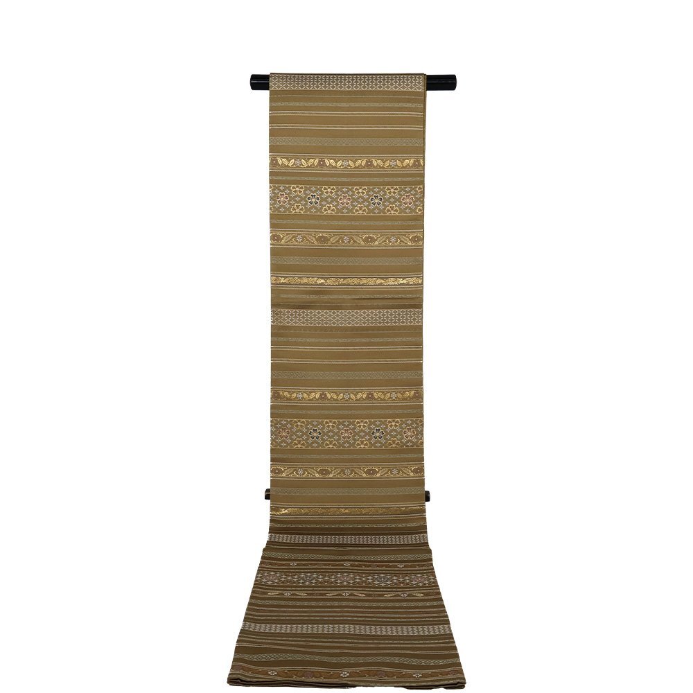 | 伝統工芸士 上石辰男氏作 本場筑前博多織 袋帯 古都錦 金茶・金地 唐花・パルメット唐草文様・菱文・兎・横縞 全通 仕立て上がり |