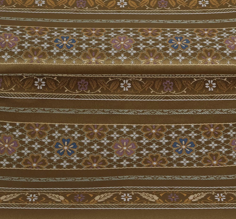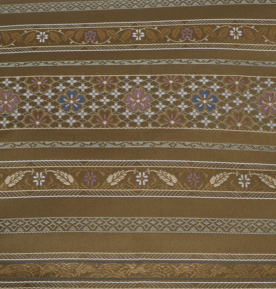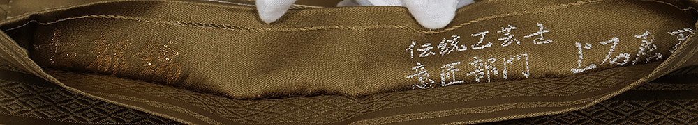 伝統工芸士 上石辰男氏作 本場筑前博多織 袋帯 古都錦 金茶・金地 唐花・パルメット唐草文様・菱文・兎・横縞 全通 (写真では上手く色が出ない場合があります。ご了承下さい) ※お使いのディスプレイの種類や設定の差により 実物の色と画像の色が少々異なることもございます。 写真の枚数が多いので一度パソコンでご覧ください。 |