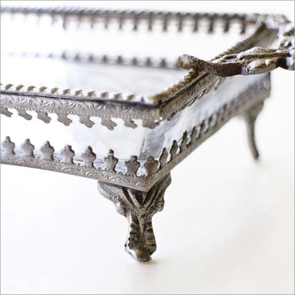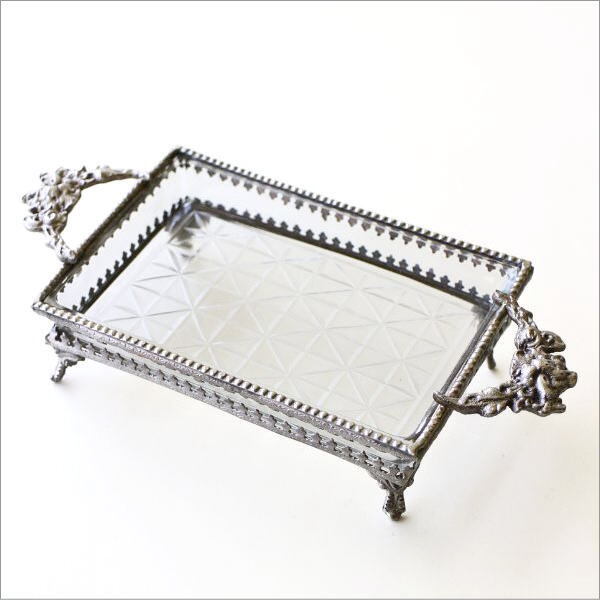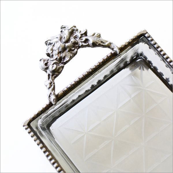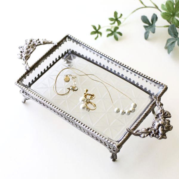 トレイ面の裏をエッチングした 厚みのあるガラスに 繊細な模様のブラスの装飾で囲った 重厚感のある脚付きハンドルトレイ ずっしりとした重みや 深みのある真鍮の色合いは 空間に高級感をプラスしてくれます 散らばりやすい、デスクや棚の上の 小物やアクセサリーをトレイにまとめると 何気なく置いたものも、 ディスプレイしたオブジェのように オシャレに決まりそうです 商品名 : 真鍮とガラスのハンドルトレー 商品番号 : vin5245 全体サイズ(cm) : 幅22×奥行10.5×高さ5 重量 : 345g 材質 : ガラス 真鍮 ※商品の特性上、小さな擦り傷や隙間、ガラスの気泡、がたつき、装飾の欠け等はご容赦ください ※ディスプレイによる色の違いはご了承下さい |