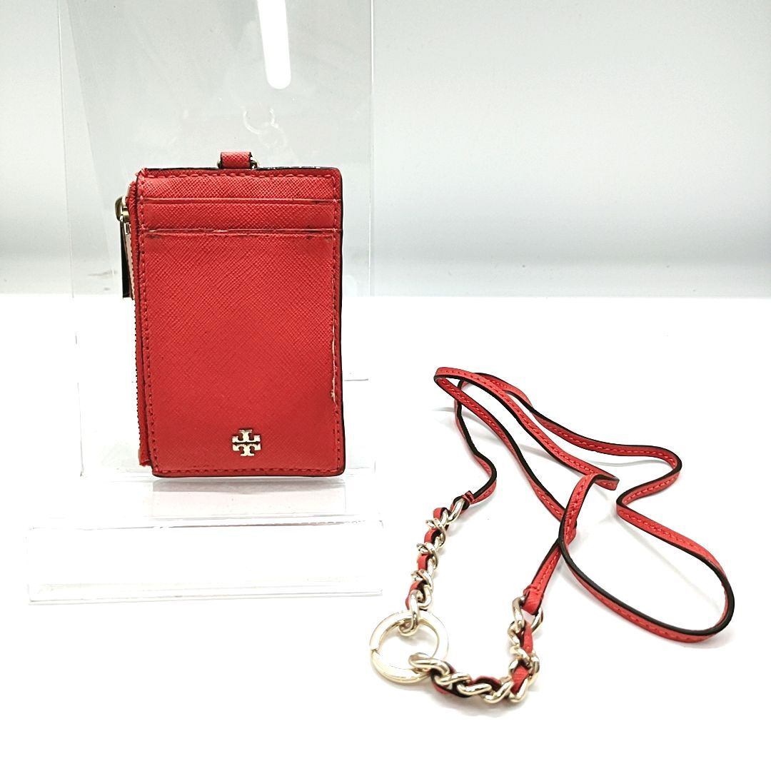 【中古/破れ有り】TORY BURCH トリーバーチ カードケース ネームホルダー コインケース ロゴ レッド×ゴールド【送料無料/匿名配送】