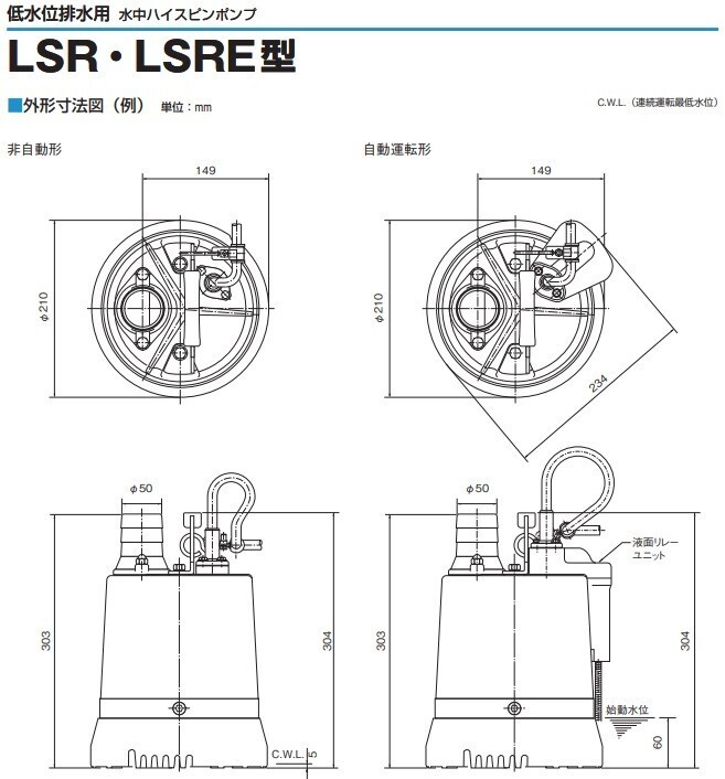 ツルミ 排水ポンプ 低水位 LSR2.4S 100V 50Hz 2インチ 排水用ポンプ 床下浸水 業務用 汚水ポンプ 小型 底水 水中ポンプ 家庭用