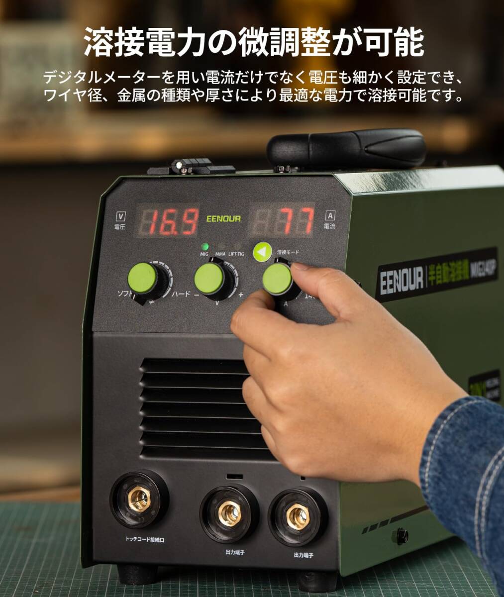• 【デジタル表示で直感的な操作】無段階の調整ダイヤルで電流と電圧を細かく設定可能、ワイヤ径、金属の種類や厚さにより最適な電力で溶接することができます。さらに、デジタルメータに電流・電圧の数値が表示されるので、視認性が大幅に向上し、より直感的な調整が可能になります。