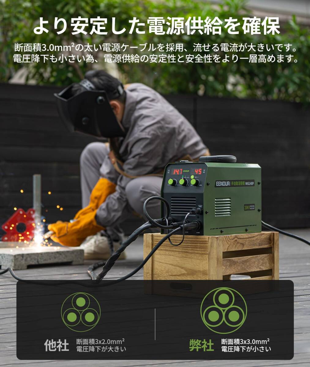 • 【140A大出力で厚板溶接が可能】最大140Aの出力による8mmまでの厚板もしっかり溶接可能です。100V電源だけでなく、単相200V電源にも対応します。200V入力でより安定したアークが得られ、フルパワーで簡単に母材を溶かすことができます。本機の電源コードにも予めエルバー型の電源プラグが付いています。そのままエアコン用の200V/20Aコンセントに挿込んで使用できます。