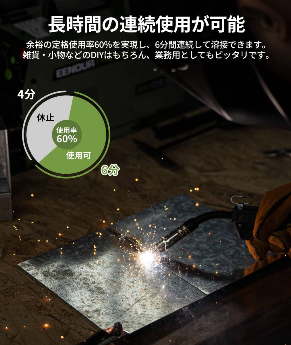 • 【一台で3つの溶接方式に対応】従来の単一機能の溶接機と異なり、本機はノンガス半自動溶接機能だけでなく、被覆アークとリフトTIG溶接機能も兼ね備えています。たった1台で鋳鉄、軟鋼、ステンレスなど様々な金属が溶接できるのでとても便利です。定格使用率も60%と高く、10分間のうち6分間連続して作業できます。
