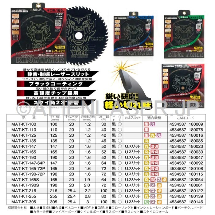 ※モニター(PCモニター・スマホ画面)の発色具合などにより、実際の商品と色が異なる場合がございます。鋭い研磨!軽い切れ味静かで直進性が良く、鋸刃のブレを抑える静音・制振レーザースリット採用! ヤニ・サビ・切粉に強く、滑りがいい切断を実現する、ブラックコーティング!高い耐久性で長寿命チップの高硬度チップ採用! チップの先端を鋭く研磨するスクイ角23°研磨採用。より軽快な軽い切れ味を実現! Uスリット採用! 引き曲りを抑え、安定感のある切断を実現。深切り丸鋸にも最適!!MAT-KT-190-72P外径190mm中心穴径20mm切削幅(刃厚)1.6mm刃数72Pコート黒スリット○台金スリットUスリット適合機種電動マルノコ・深切りマルノコ※モニターの発色具合により、実際のものと色が異なる場合がございます。