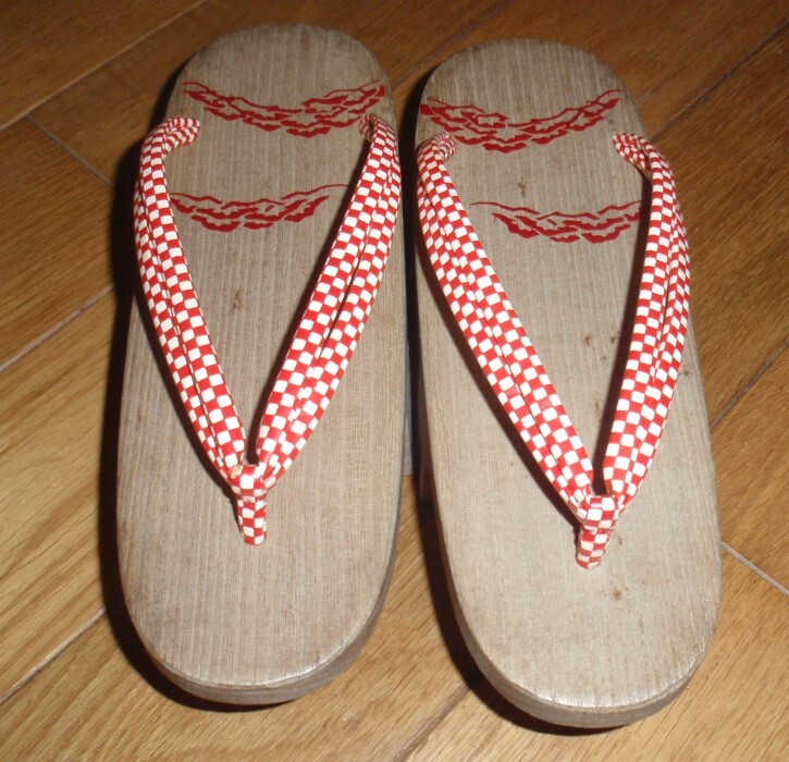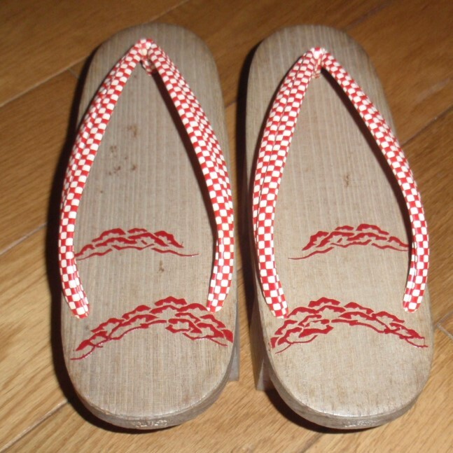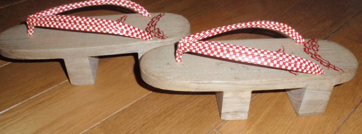 台は軽い桐材で、松の柄の紋様が本朱色の塗りで施されています。鼻緒は牛皮調の紅白の市松模様の二重鼻緒です。