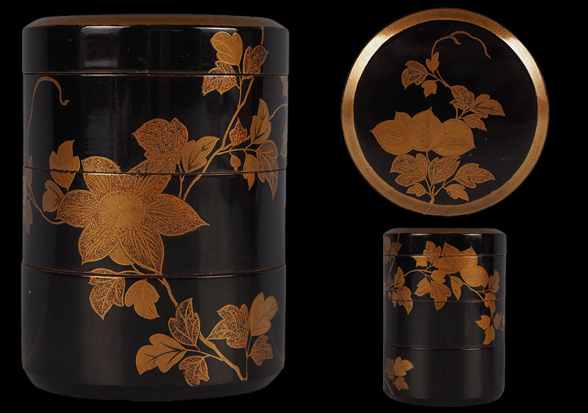 | VM16 旧家初出 金蒔絵 三段 丸重 香合 高さ7.5cm / 煎茶道具 香道具 香丸重 漆器 在銘 中国古玩 | |