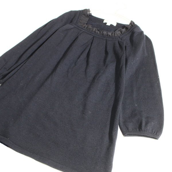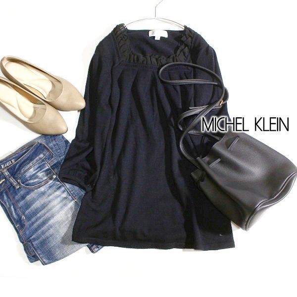 美品 MICHEL KLEIN ミッシェルクラン 大人可愛い シフォンフリル クォータースリーブ ウール ニット プルオーバー 38号 M 春 秋 冬 24C10