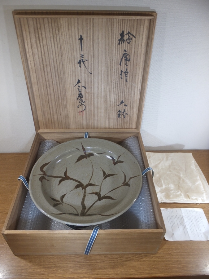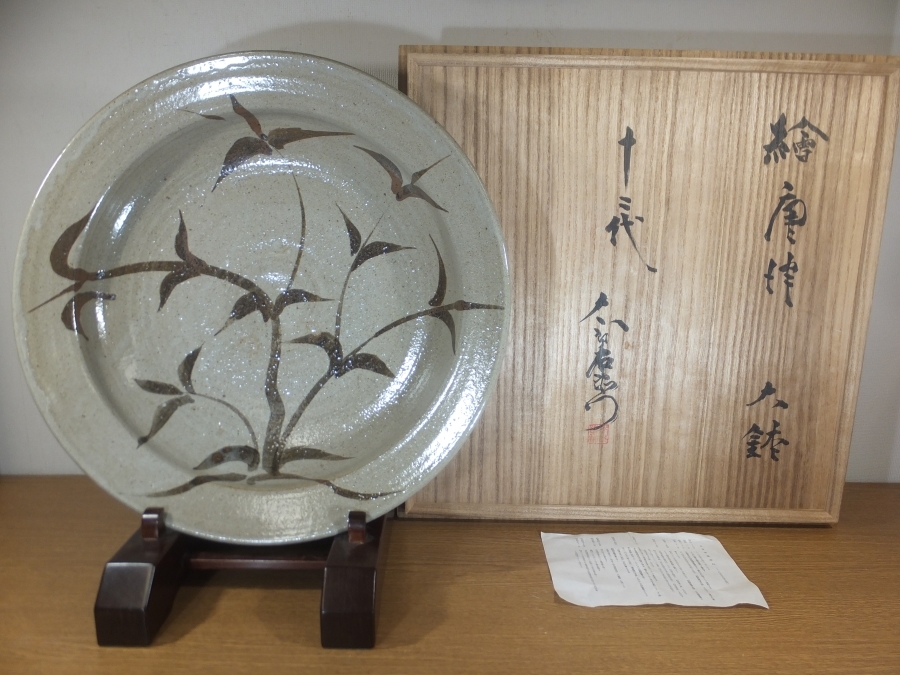 | 説明 | 佐賀県出身 陶芸家で人間国宝 12代 中里太郎右衛門の、 『絵唐津大鉢』本人作 無傷 共箱 布 シオリ付 名品です。 状態は良好です。 このままで飾って楽しめますし、使用しても楽しめます。 高台内に「タ」の彫銘があります。 素早い筆致で力強く草紋様を描いています。 描かれた紋様はデザイン化されていますので、季節を問わず使用して楽しめます。 大きさもありますので、飾り栄えすると思います、画像で御確認下さい。 コレクターの放出品です。 皿立ては、撮影の為に使用したもので、作品には付帯致しません。 ★九州地方の買出し品です。 買出したままでの出品です、御入札宜しくお願い致します。 入札は早めにお願い致します。 一人でも入札があれば梱包作業に入りますので、素早い発送が可能です。 早期終了あり。 12代 中里太郎右衛門は、(1895-1985) 大正-昭和時代の陶芸家。 明治28年4月11日生まれ。 佐賀県出身。 有田工業卒。 幼名は重雄。 昭和2年12代をつぐ。 唐津古窯跡の調査をおこない, 古唐津の技法を研究,復興につとめる。 40年唐津焼初期の割竹式登り窯を復元した。 44年出家し無庵と名のる。 51年人間国宝。 昭和60年1月5日死去 89歳。 |