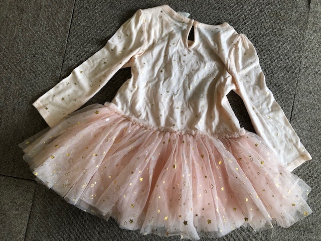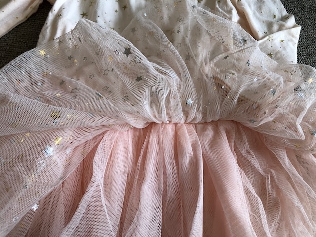 トップス部分は柔らかいTシャツ素材で、スカート部分はたっぷりとしたチュールでふんわりとしたデザインの可愛いワンピです。